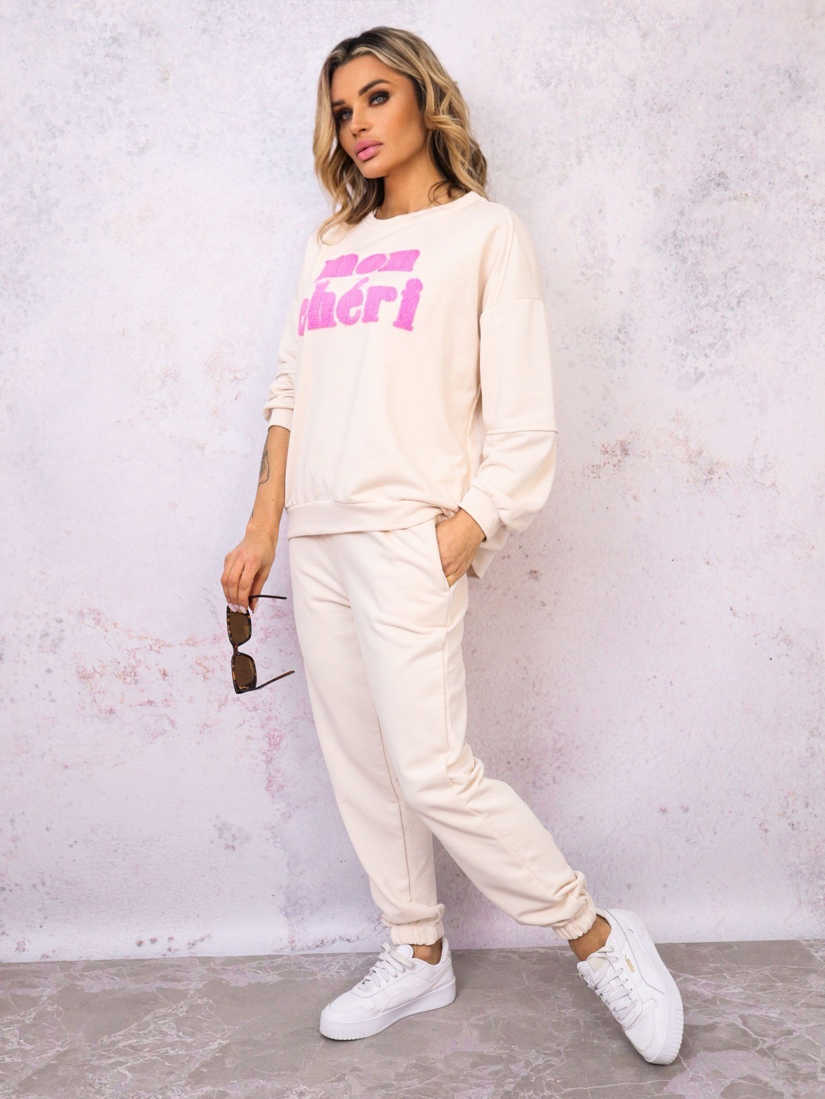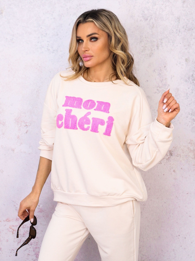KOMPLET DRESOWY BLUZA Z NAPISEM+ SPODNIE- BEŻOWY