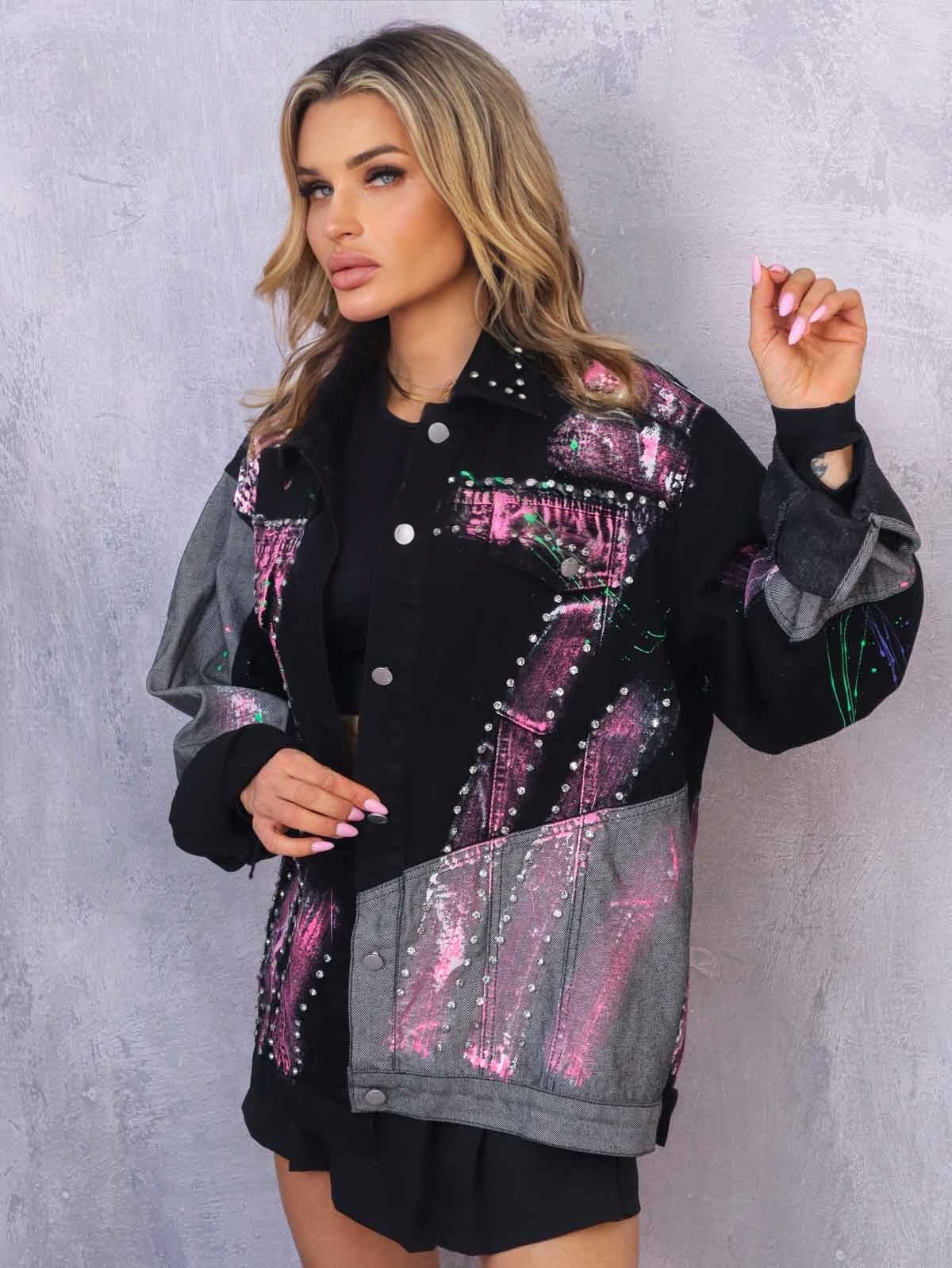 KURTKA JEANSOWA W KOLOROWE WZORY ZDOBIONA KRYSZTAŁKAMI- CZARNA