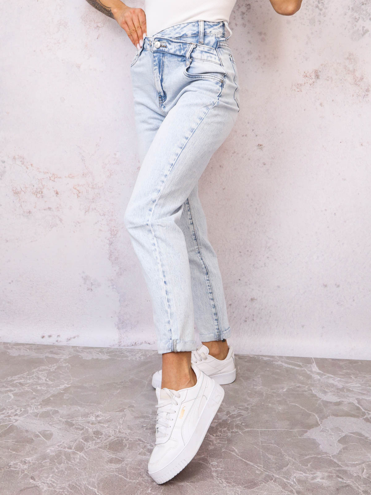 SPODNIE JEANSOWE MOM FIT Z ASYMETRYCZNYM PASEM- JASNY JEANS