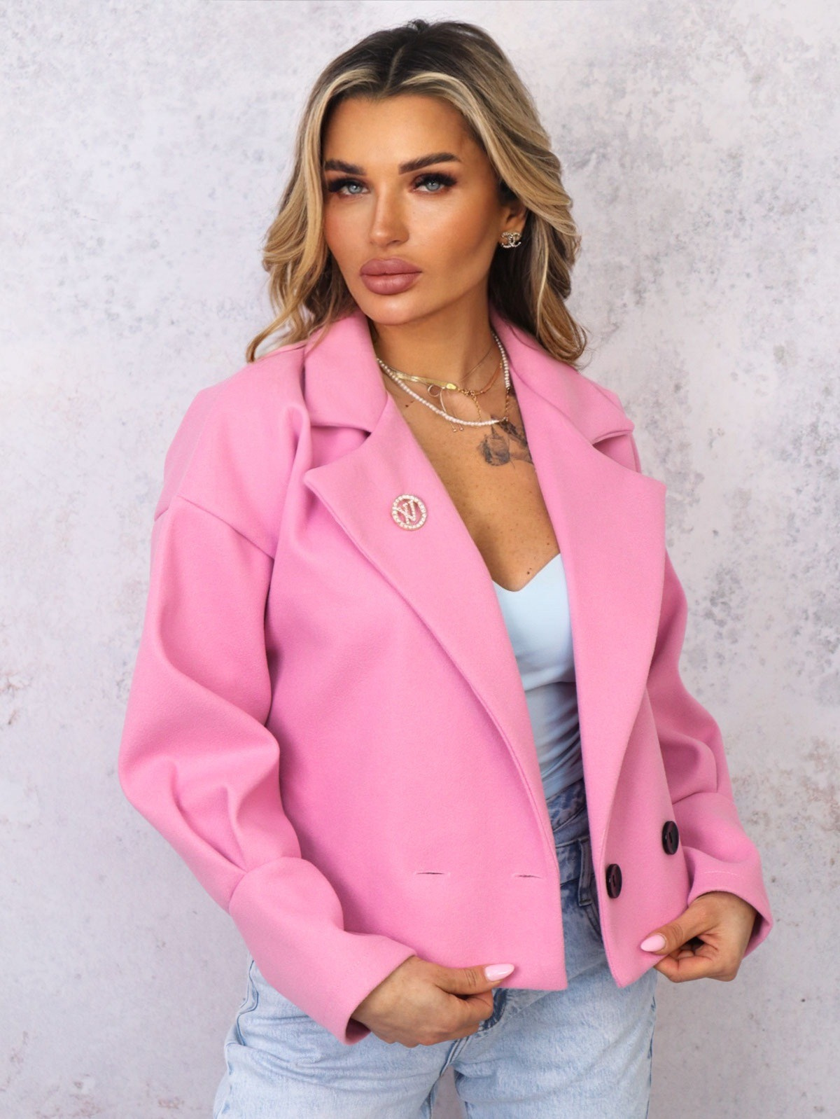 KRÓTKI PŁASZCZ Z KOŁNIERZEM I OZDOBNĄ BROSZKĄ- JASNORÓŻOWY