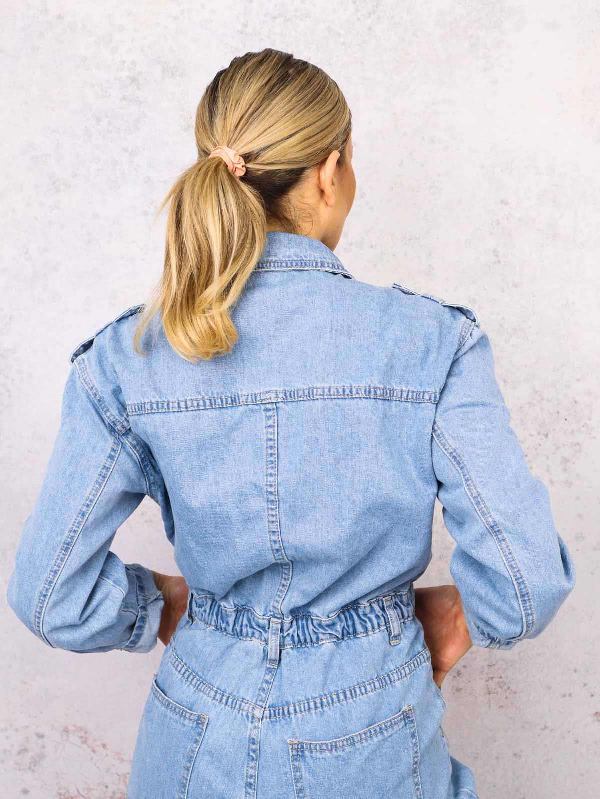 Długi kombinezon z wysokiej jakości jeansowego materiału. Szlufki w pasie. Zapięcie z przodu na metalowe guziki.