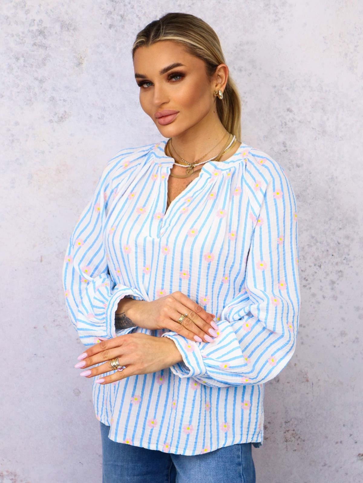 BLUZKA KOSZULOWA W PASKI I KWIATKI- NIEBIESKA