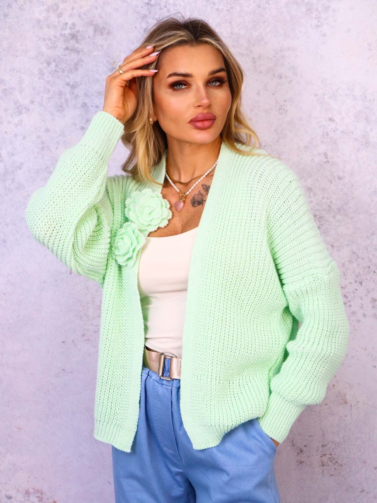 KRÓTKI KARDIGAN Z PRZYPINANYMI KWIATAMI- ZIELONY
