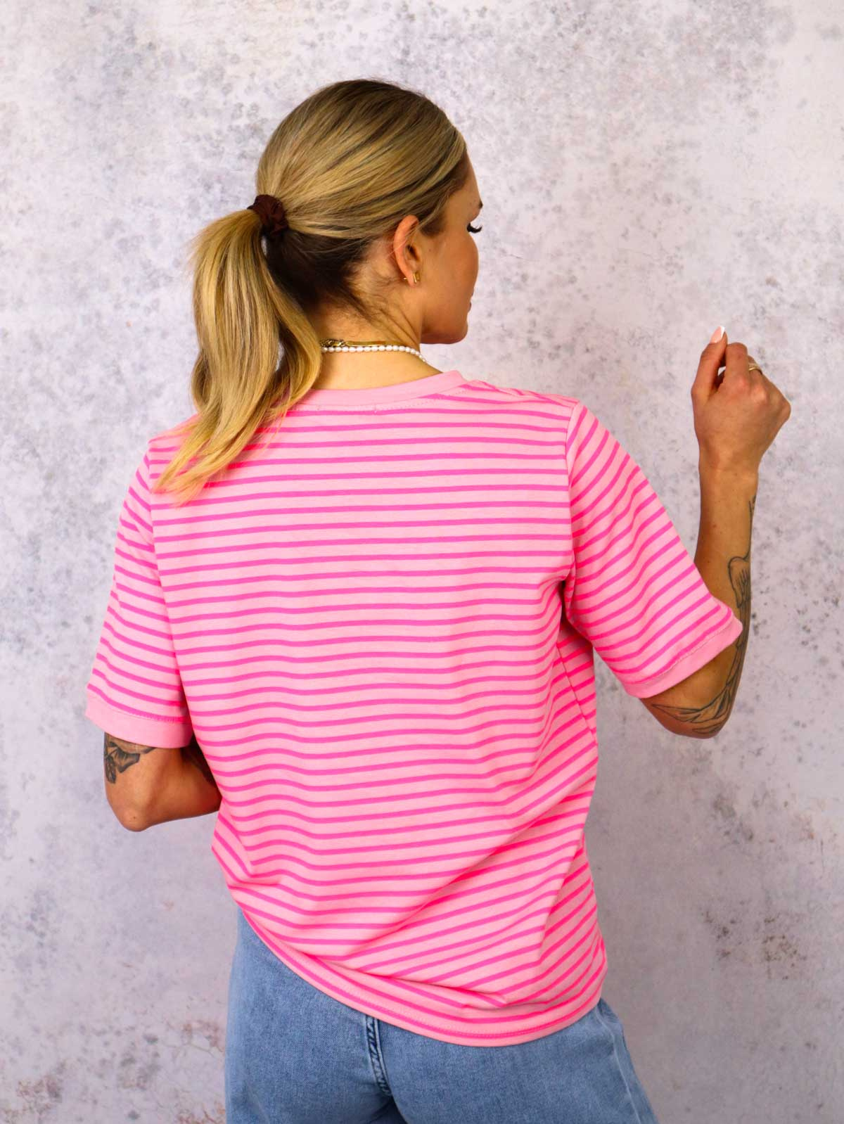 T-SHIRT OVERSIZE W PASKI- RÓŻOWO-FUKSJOWY