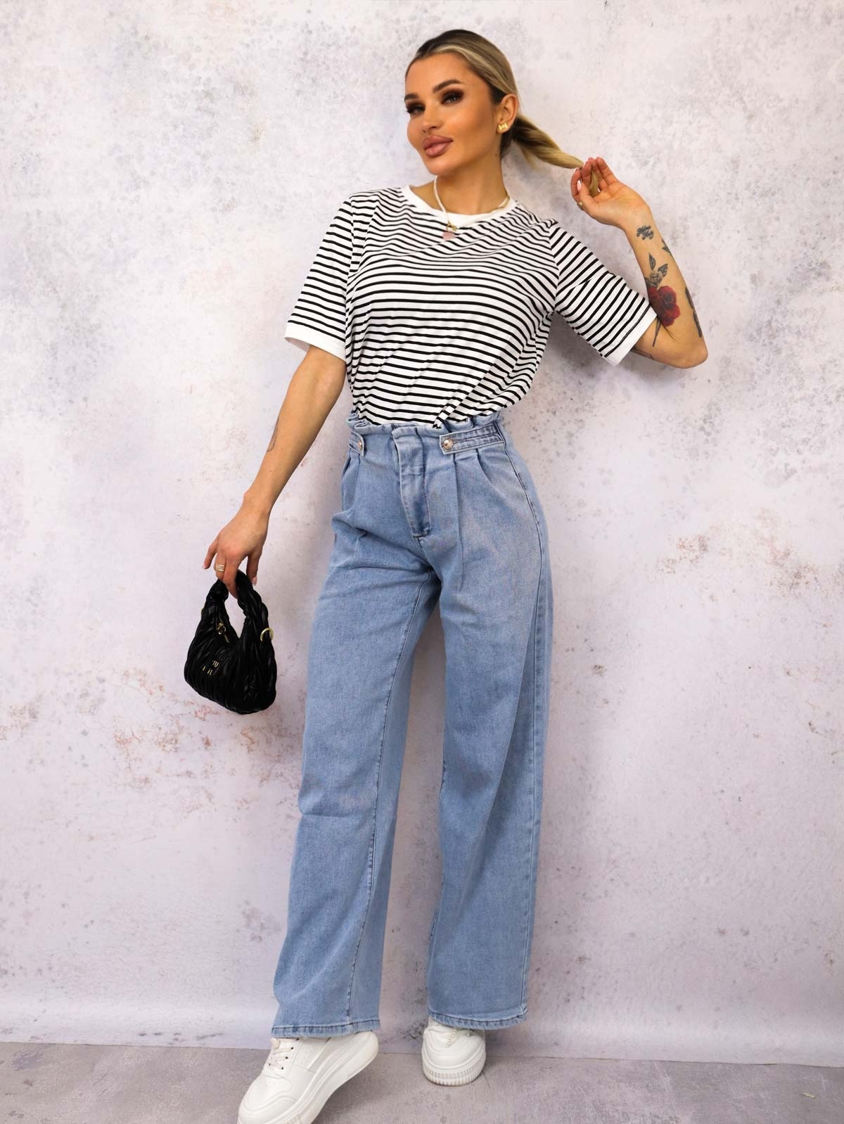 Spodnie jeansowe z szerokimi nogawkami. Ozdobne paski w pasie zapinane na złote guziki.
