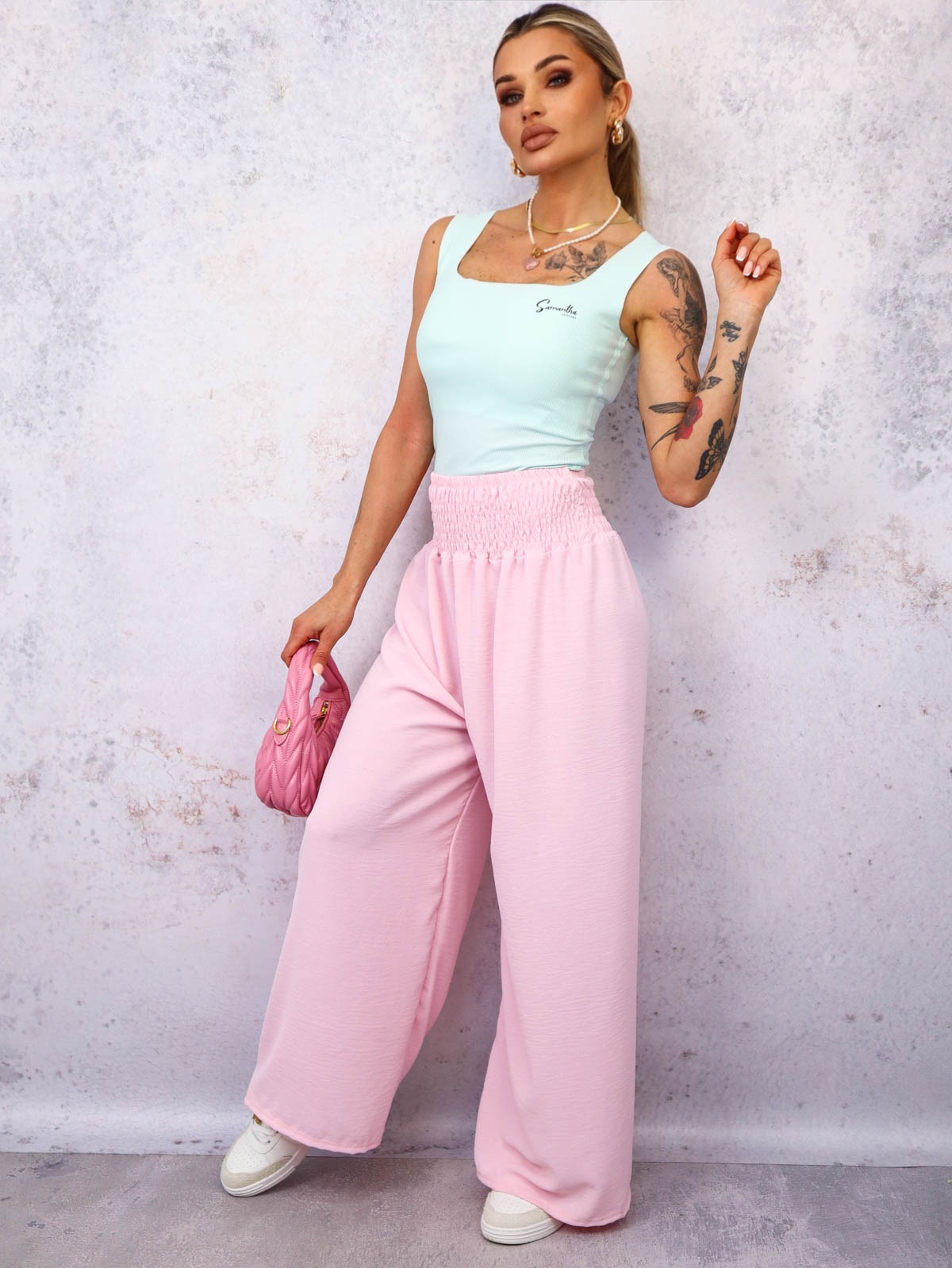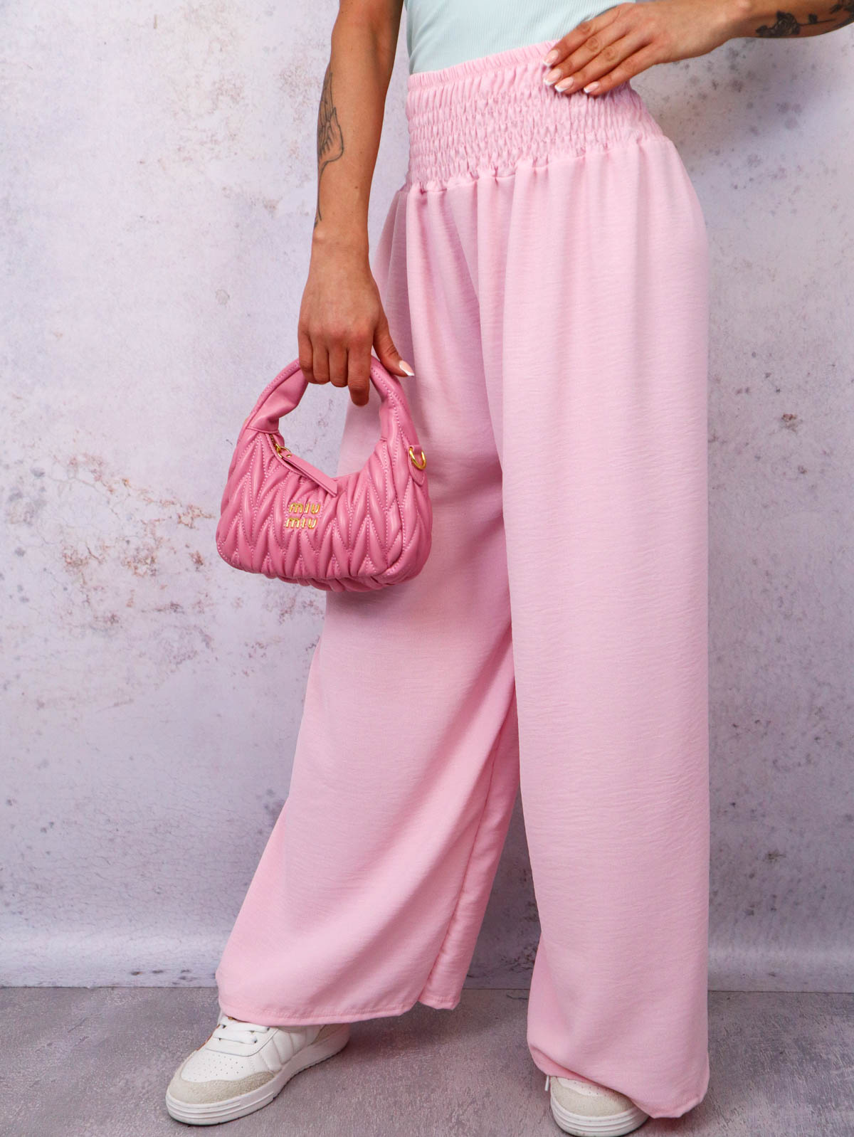 SPODNIE MATERIAŁOWE Z SZEROKIMI NOGAWKAMI I GUMĄ W PASIE- PUDROWY RÓŻ