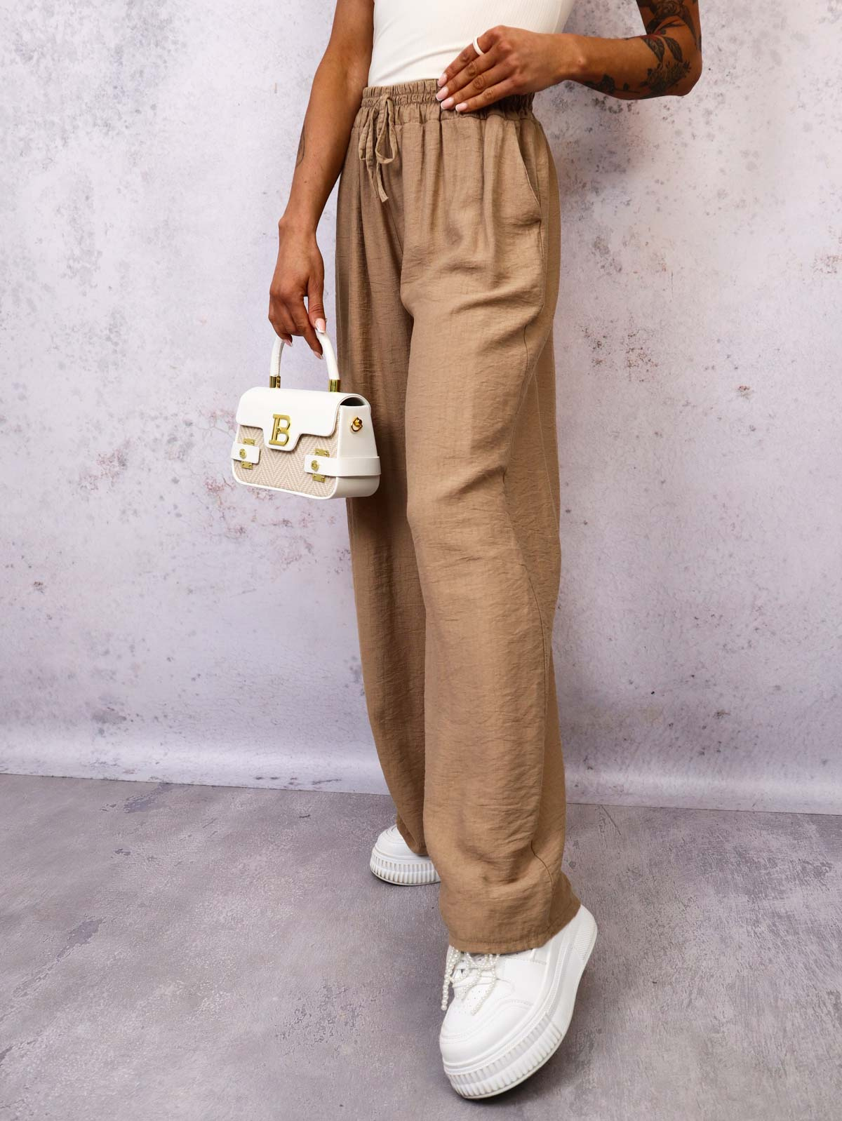 SPODNIE MATERIAŁOWE Z SZEROKIMI NOGAWKAMI- JASNOBRĄZOWE