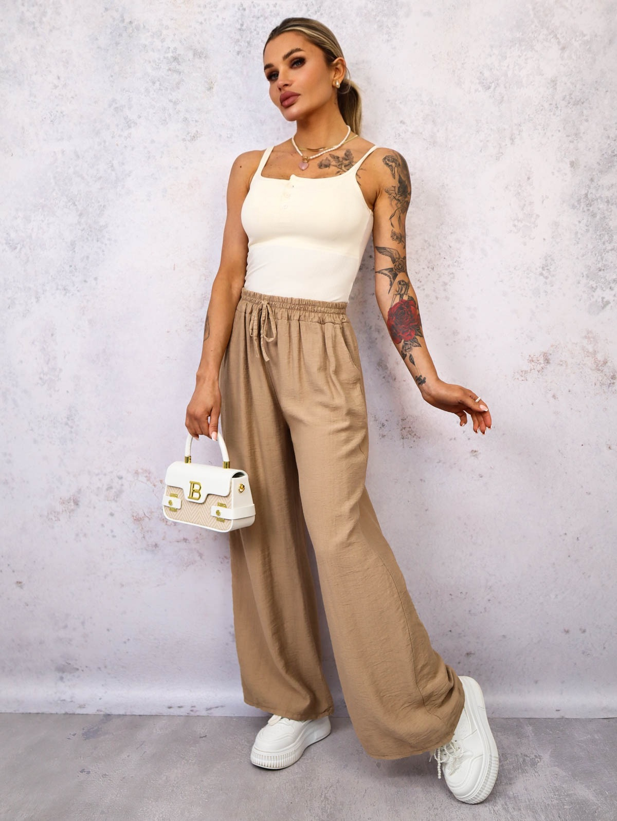 Spodnie materiałowe z szerokimi nogawkami. Posiadają gumę i wiązanie w pasie