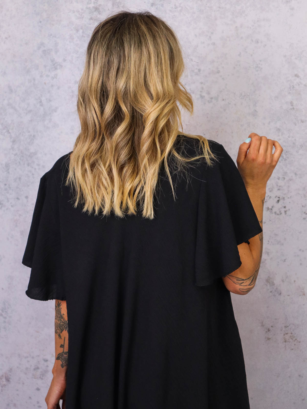 SUKIENKA Z KWIATEM I FALBANAMI NA RĘKAWACH- CZARNA