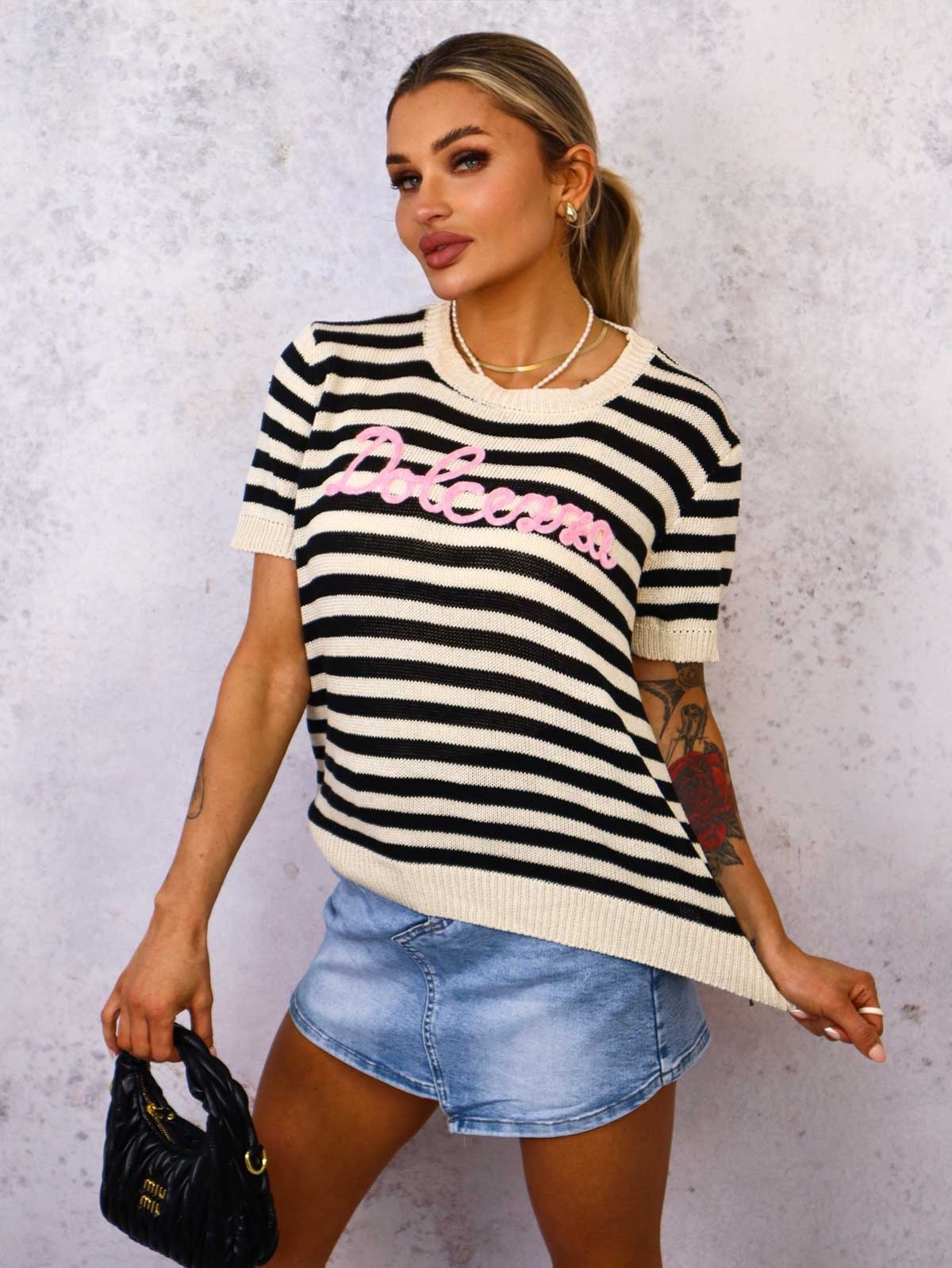 SWETER W PASKI Z KRÓTKIM RĘKAWEM I OZDOBNYM NAPISEM- CZARNY