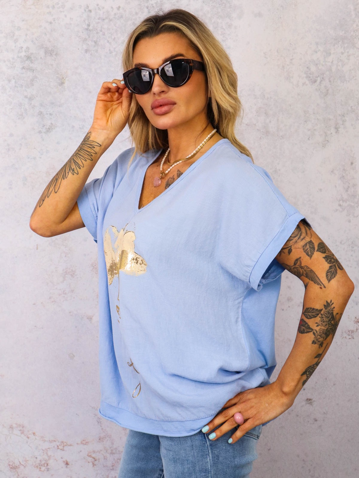 T-SHIRT ZE ZŁOTYM KWIATEM I DEKOLTEM W SZPIC- NIEBIESKI