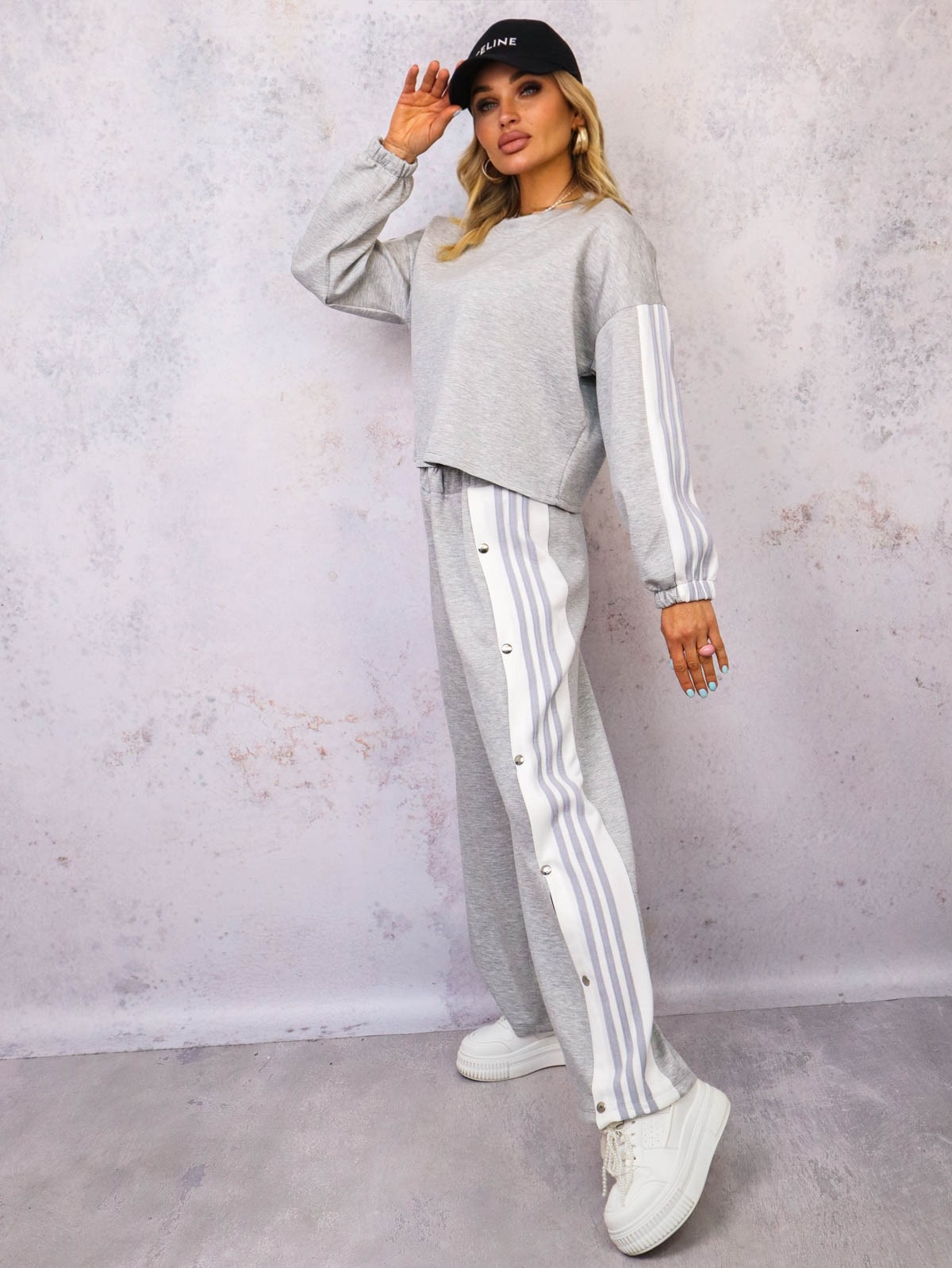 Komplet dresowy spodnie z lampasami i zatrzaskami po bokach+ bluza o krótkim kroju z lampasami na rękawach.