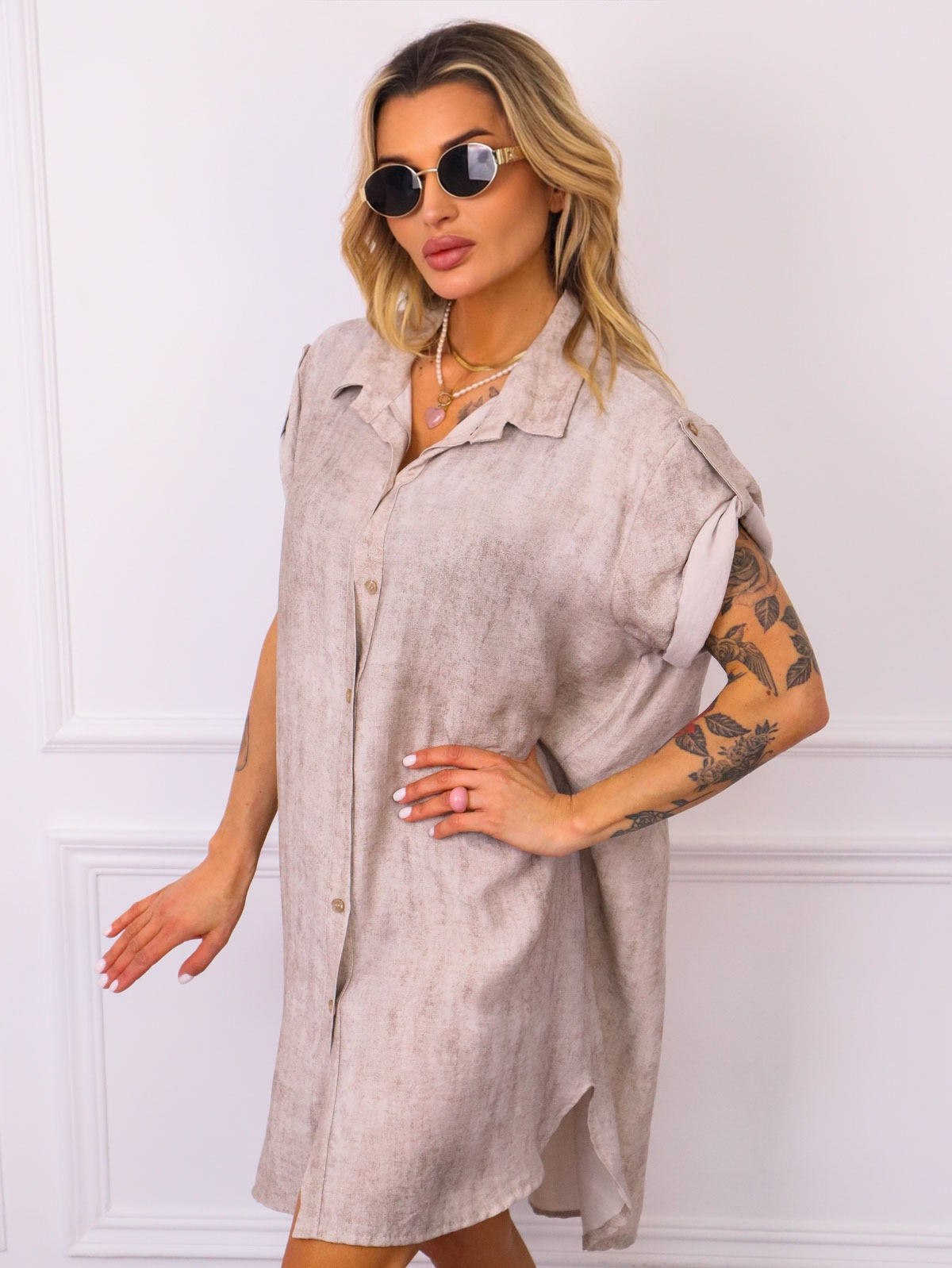 Dekatyzowana sukienka koszulowa zapinana na guziki. Rękawy podwijane.
