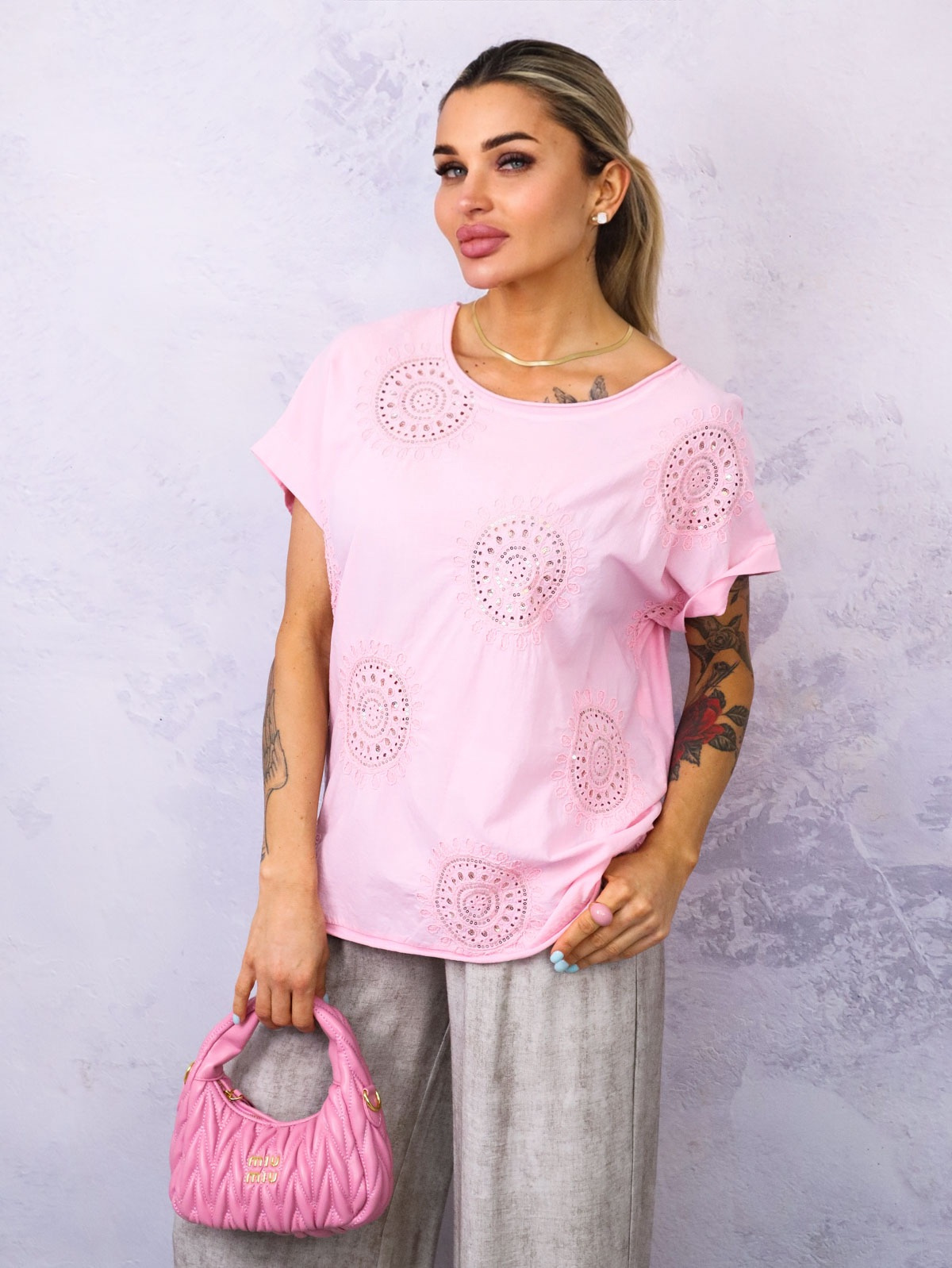 BLUZKA Z HAFTOWANYM WZOREM ZDOBIONA CEKINAMI- RÓŻOWA