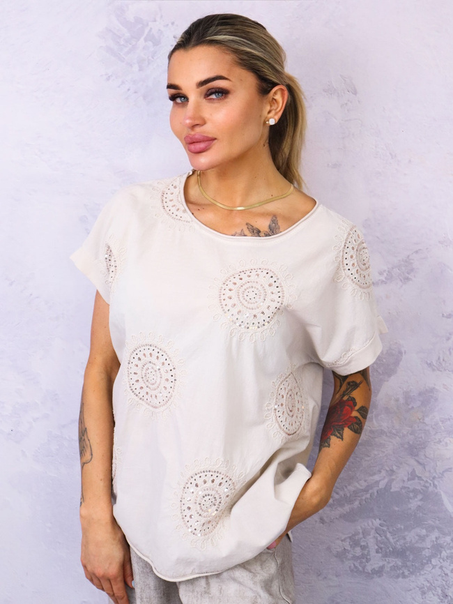 BLUZKA Z HAFTOWANYM WZOREM ZDOBIONA CEKINAMI- BEŻOWA