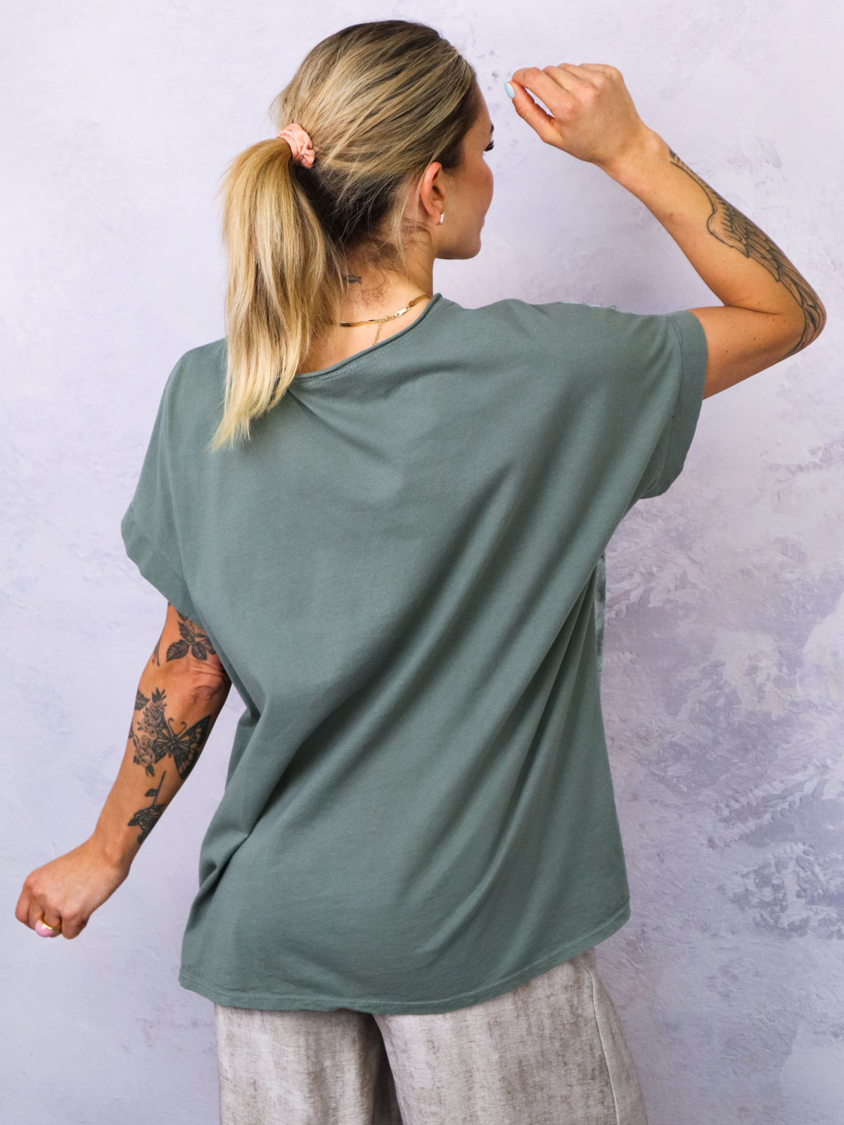 BLUZKA WZORZYSTA ZE ZŁOTYM NAPISEM- KHAKI