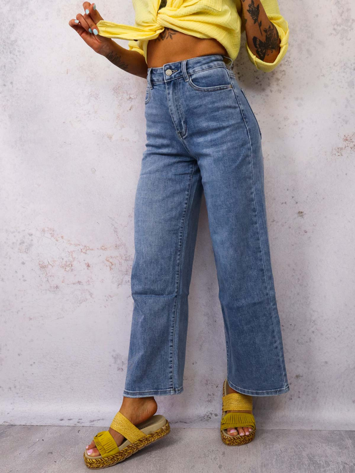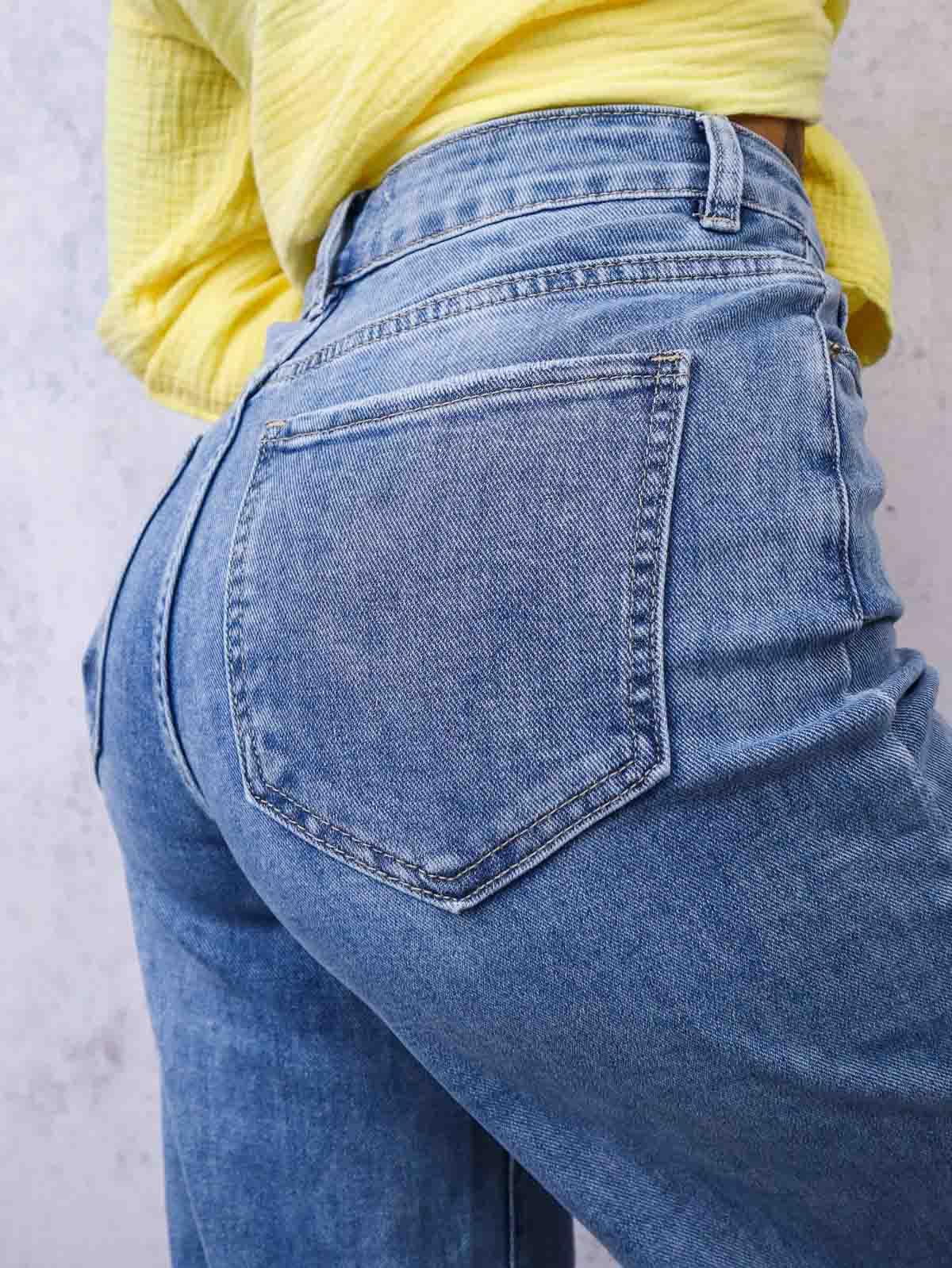 Spodnie jeansowe z wysokim stanem i szerokimi nogawkami.
