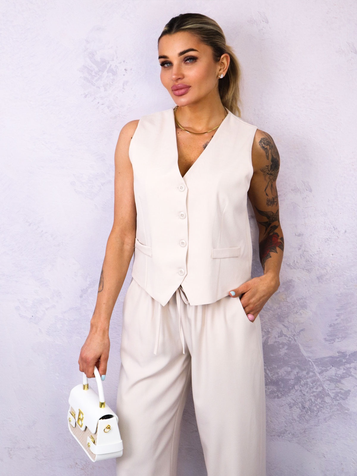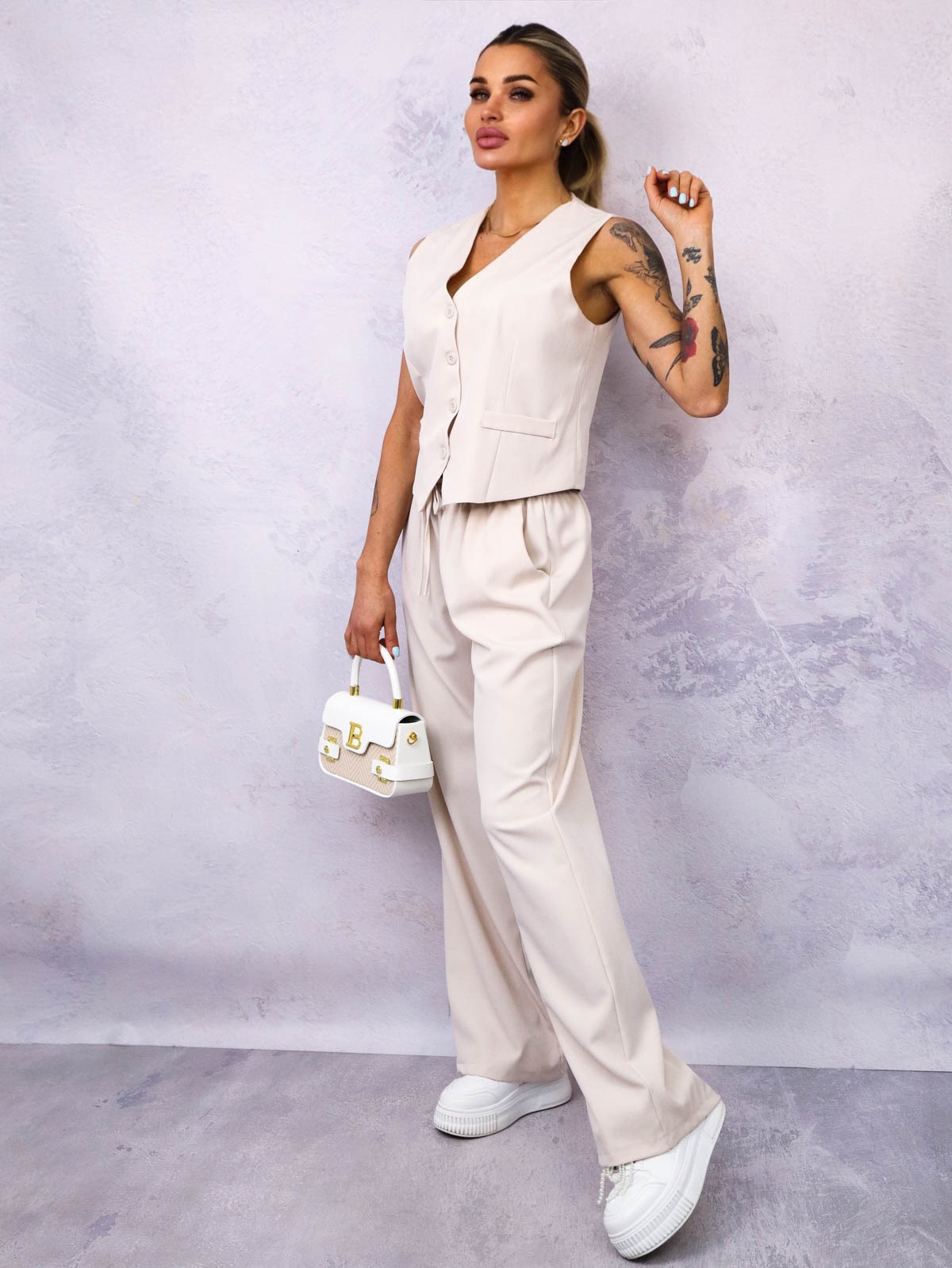 KOMPLET KAMIZELKA+ SPODNIE Z SZEROKIMI NOGAWKAMI- BEŻOWY