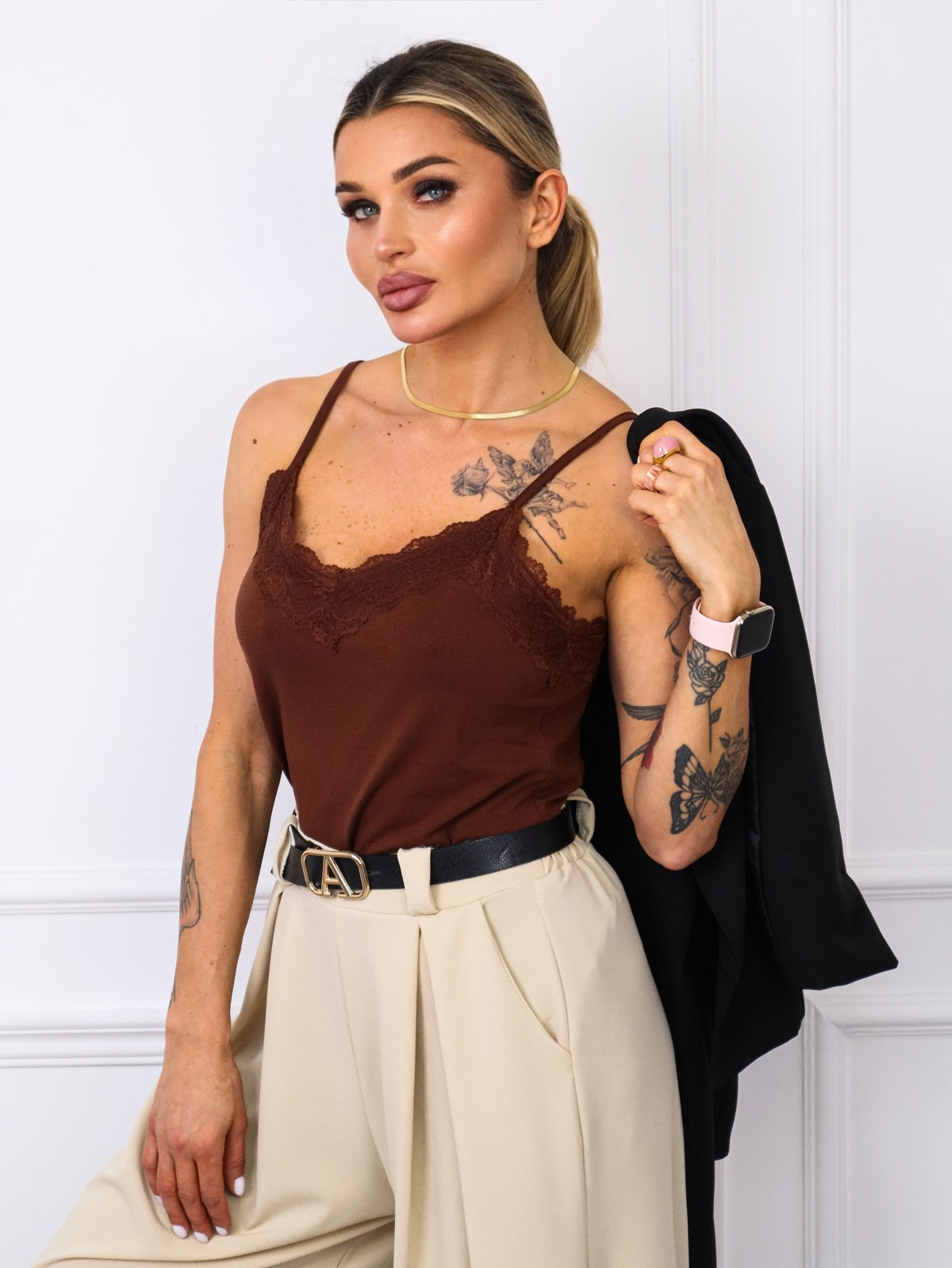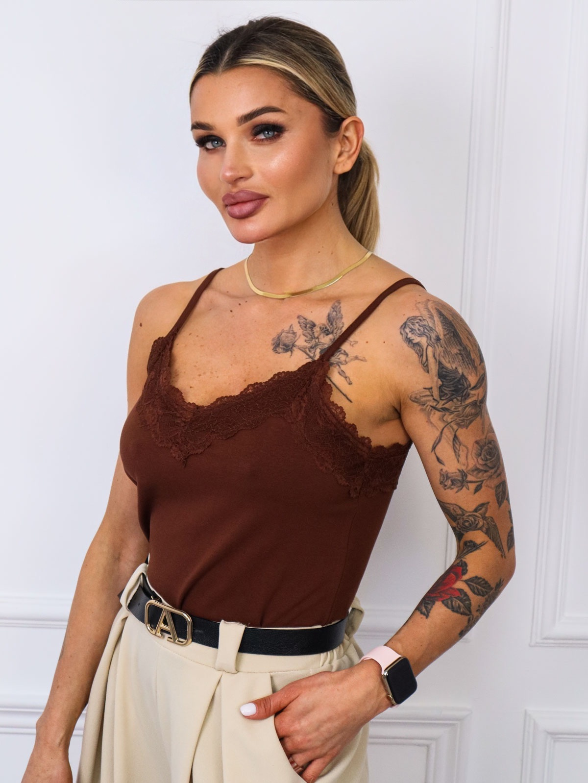 TOP NA RAMIĄCZKACH Z OZDOBNĄ KORONKĄ- BRĄZOWY