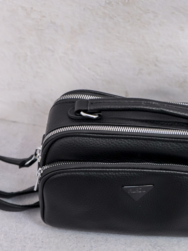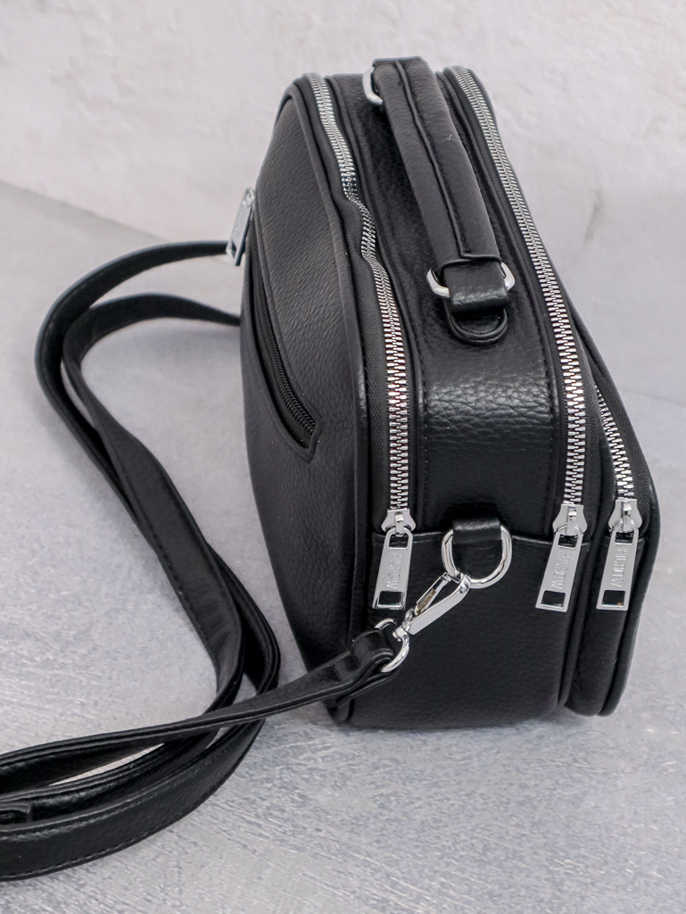 Torebka kuferek z ekoskóry. Dwie duże komory zapinane na zamek, jedna mniejsza z przodu. Regulowany pasek z ekoskóry.