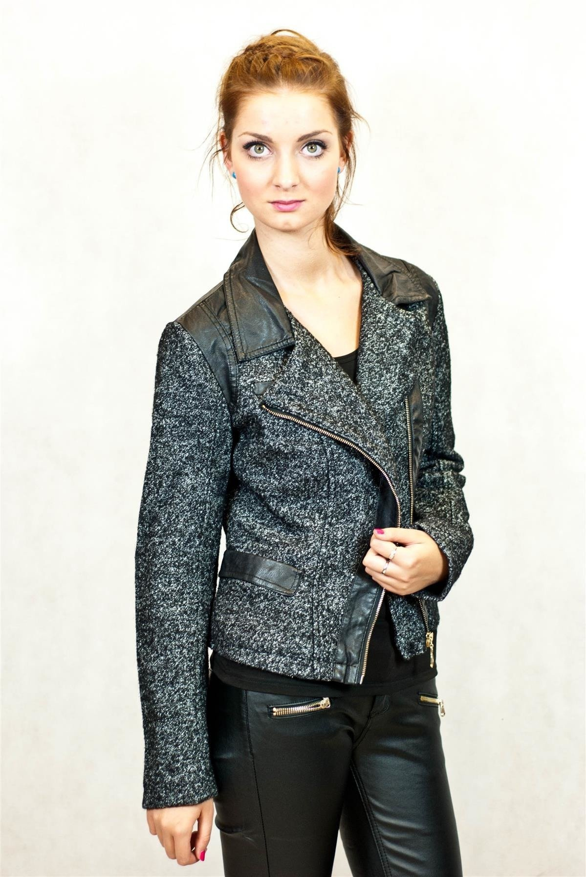 Stylowa ramoneska, ze wstawkami ze skóry ekologicznej, zapinana na boku. Z przodu dwie kieszonki obszyte skórą ekologiczną. Świetnie sprawdzi się w wielu codziennych stylizacjach.