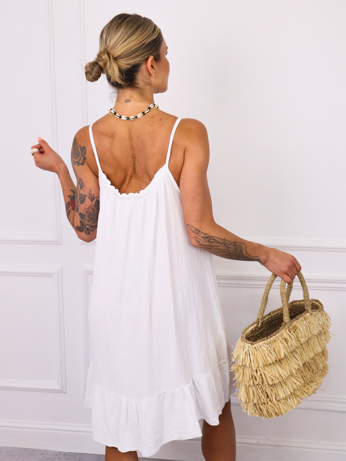 Sukienka mini wykonana z wysokiej jakości muślinowego materiału. Falbana na dole.