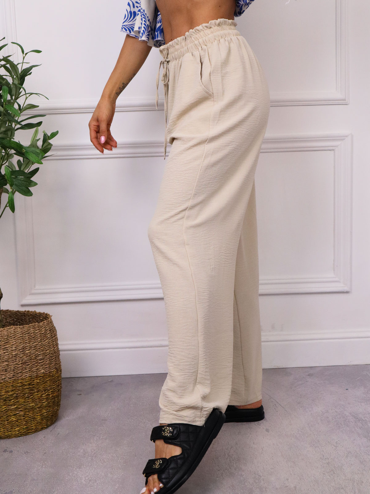 SPODNIE MUŚLINOWE Z WIĄZANIEM I GUMĄ W PASIE- BEŻOWE