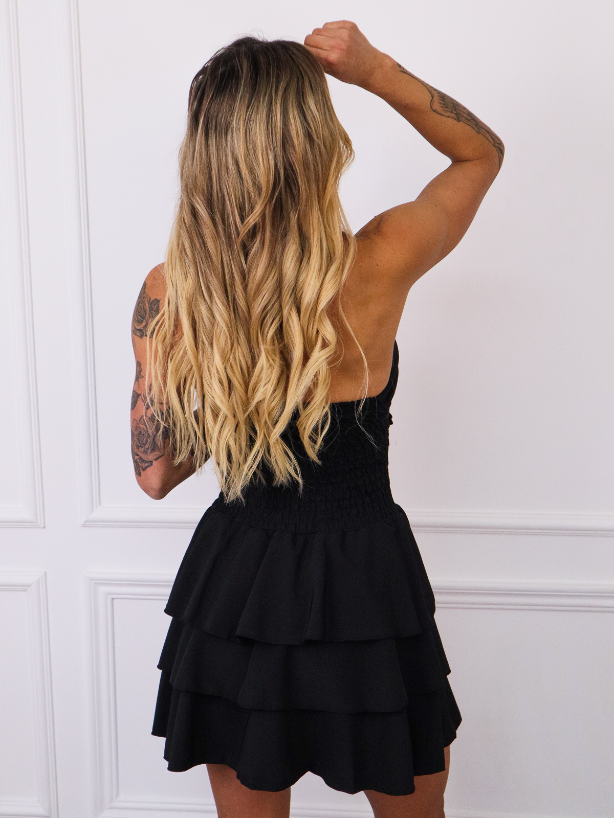 SUKIENKA MINI Z WIĄZANIEM NA SZYI I FALBANAMI- CZARNA