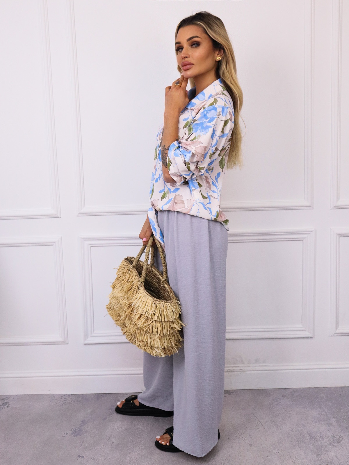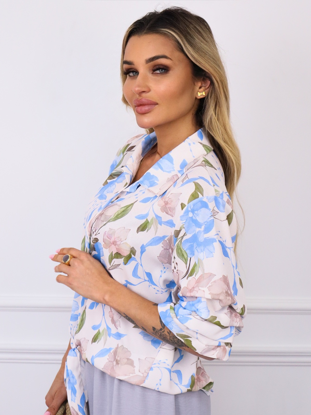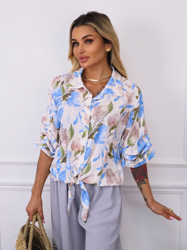KOSZULA W NIEBIESKIE KWIATY Z DRAPOWANYMI RĘKAWAMI I WIĄZANIEM