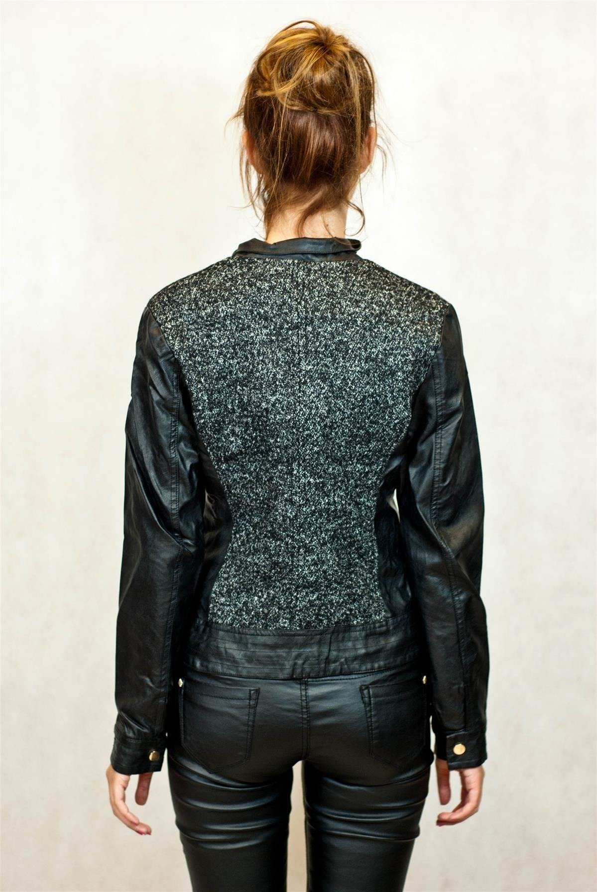 Niezwykle stylowa kurtka, z łączonych materiałów. Rękawy oraz boki, wykonane ze skóry ekologicznej. Przód i tył z grubszego materiału. Zapinana na zamek. Z przodu dwie kieszenie, zapinane na ozdobne zamki, rękawy zapinane na zatrzaski.