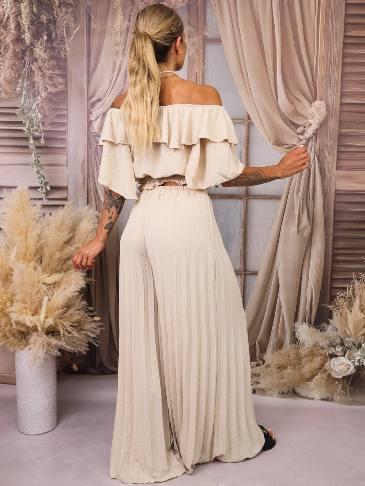 KOMPLET TOP HISZPANKA+ SPODNIE PLISOWANE- BEŻOWY