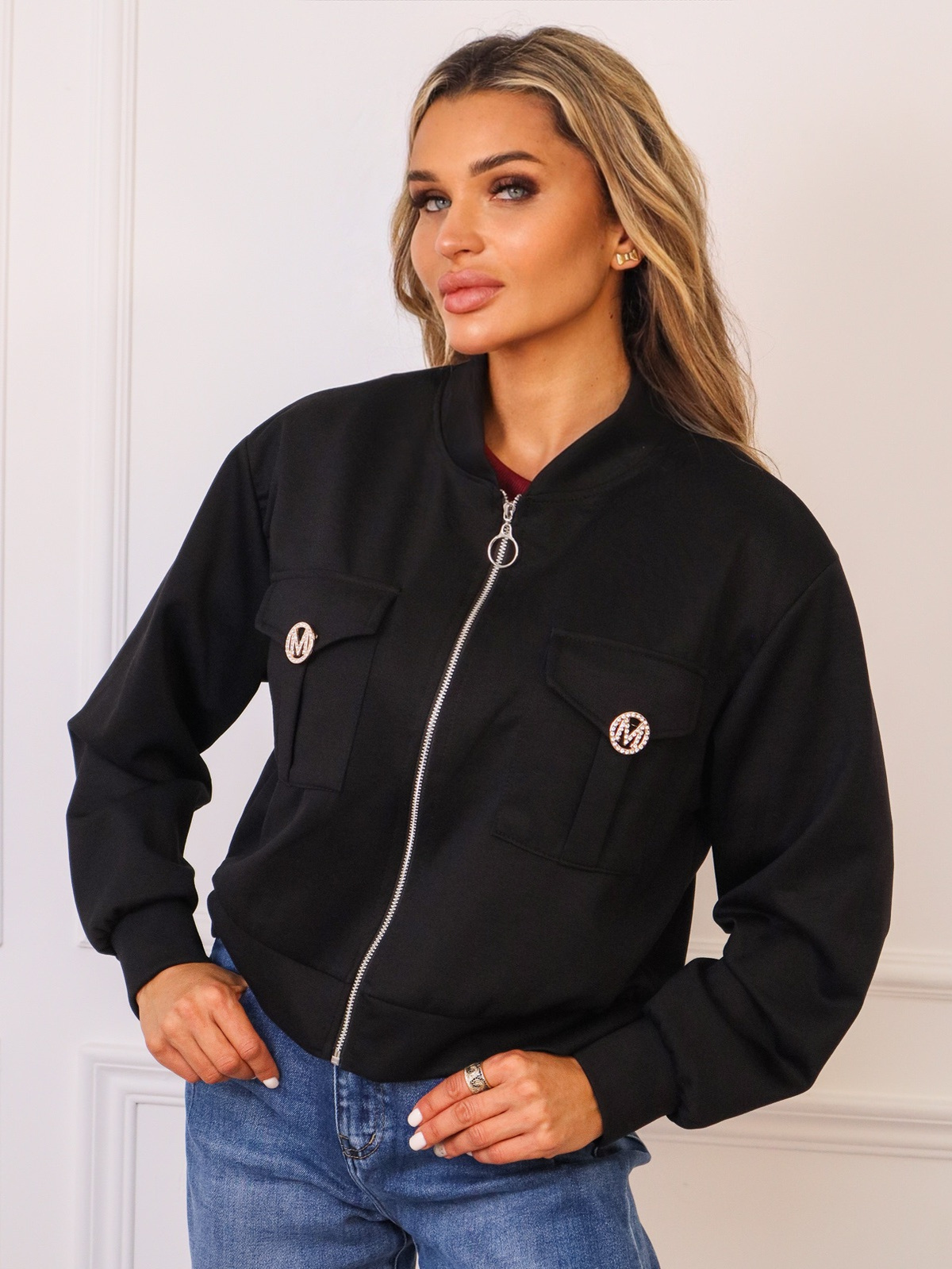 Bluza o kroju bomberki, zapinana na zamek. Z przodu kieszenie z ozdobnymi broszkami.