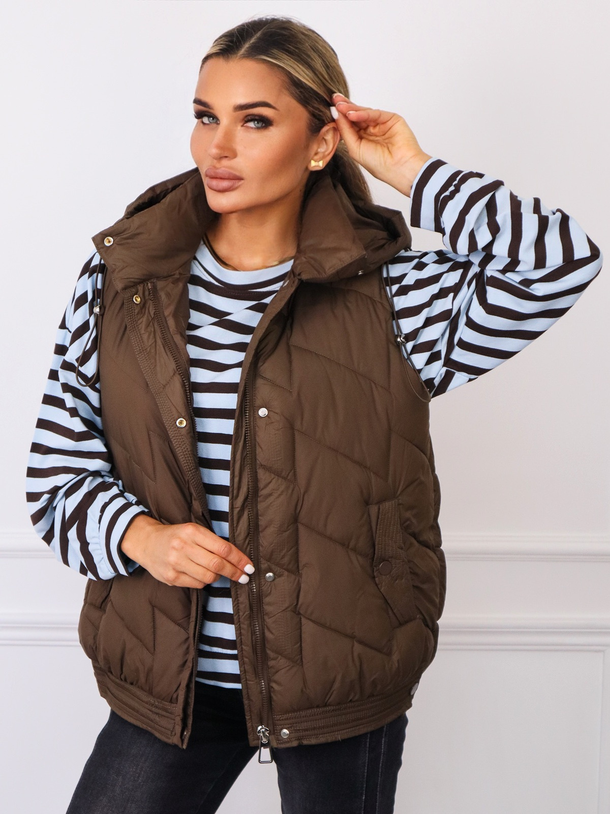 Pikowana kamizelka z nieodpinanym kapturem oraz zatrzaskami po bokach
