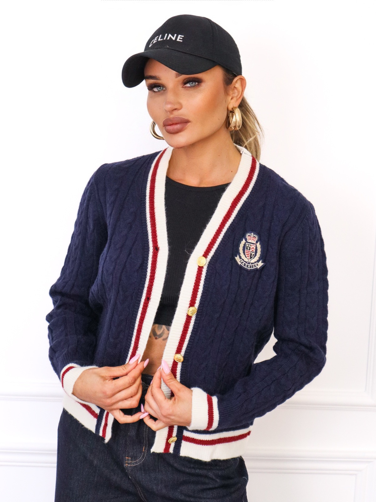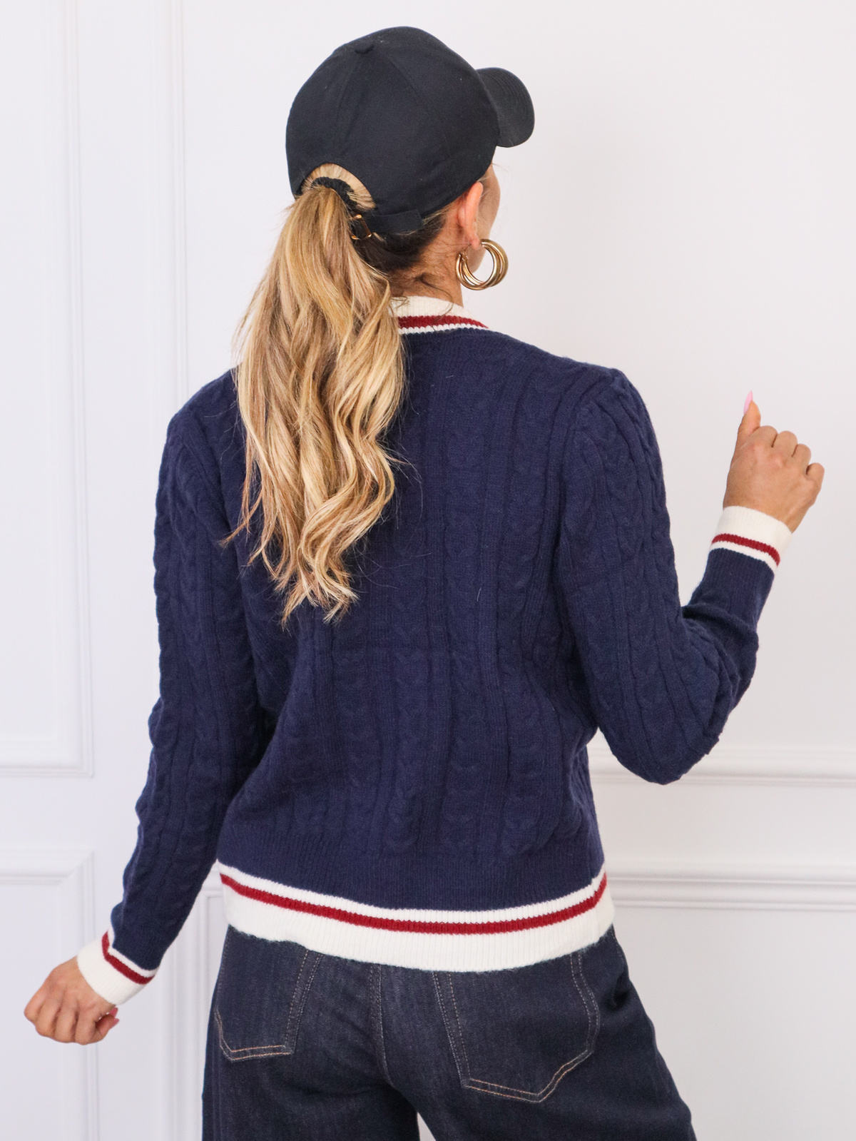 Sweter kardigan zapinany na guziki. Warkoczowy splot i kontrastowe wykończenia. Dekolt w szpic.