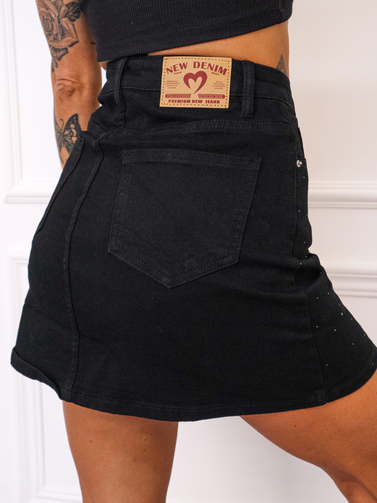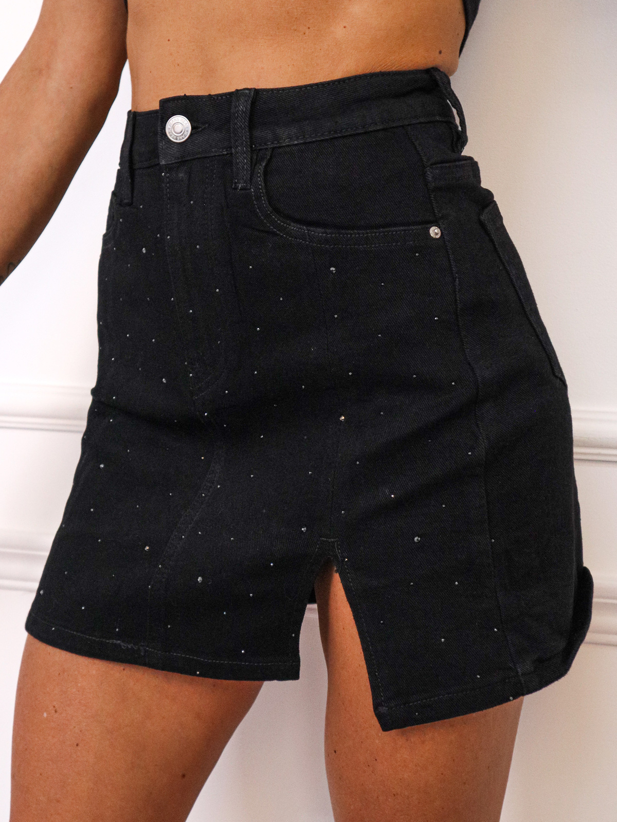 SPÓDNICA JEANSOWA Z UKRYTYMI SZORTAMI W CYRKONIE- CZARNA