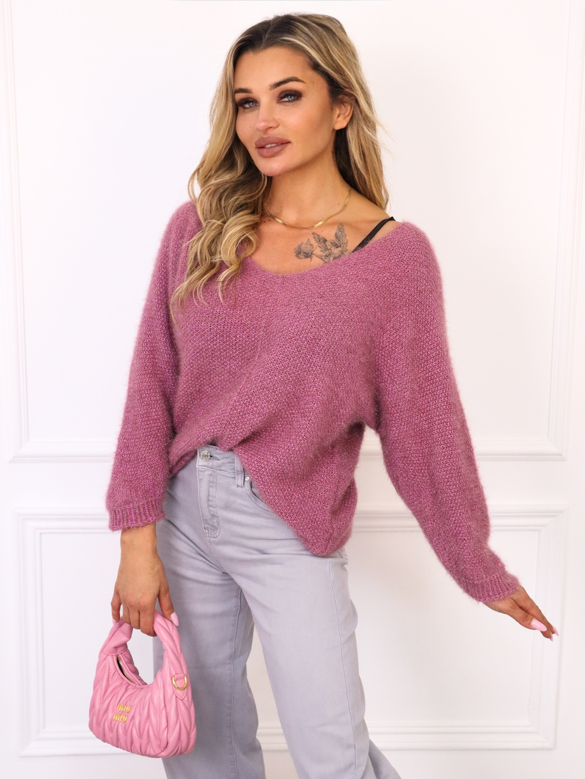 ASYMETRYCZNY SWETER Z DEKOLTEM W SZPIC Z DOMIESZKA WEŁNY I MOHERU- RÓŻOWY