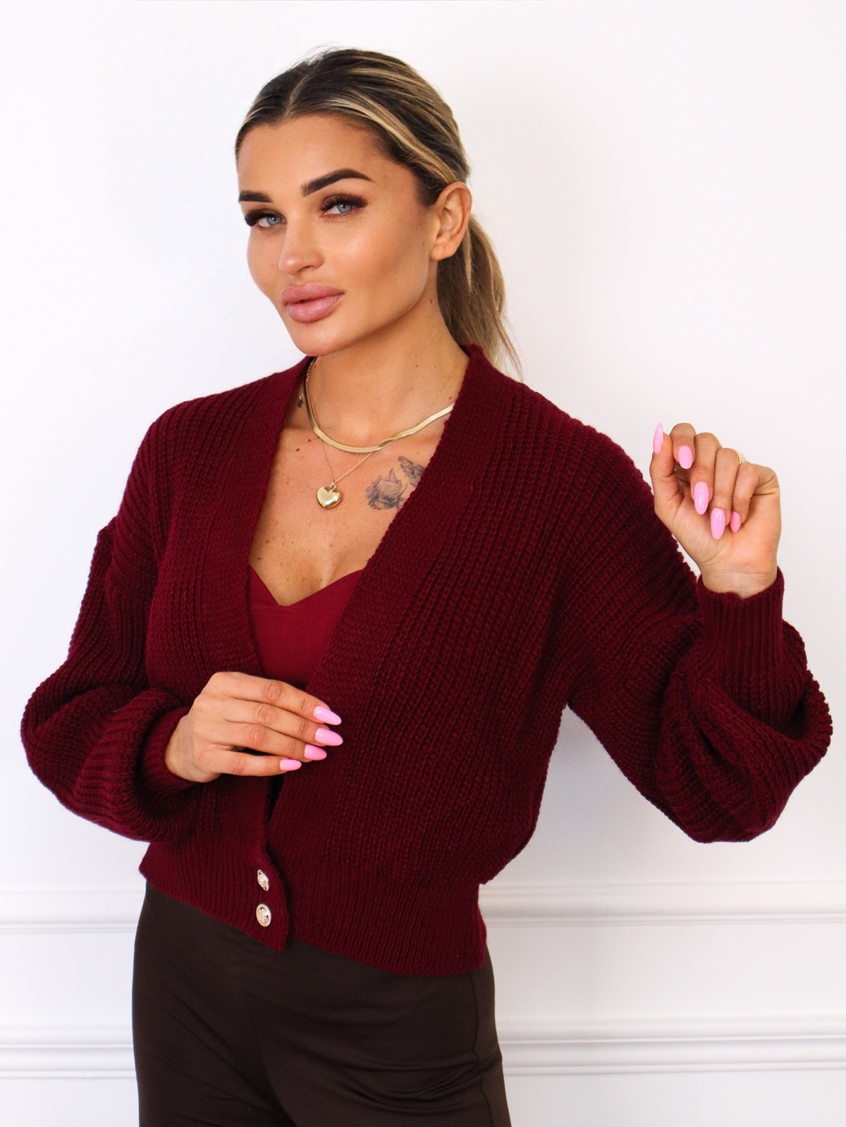 SWETER KARDIGAN ZAPINANY NA GUZIKI- BORDOWY