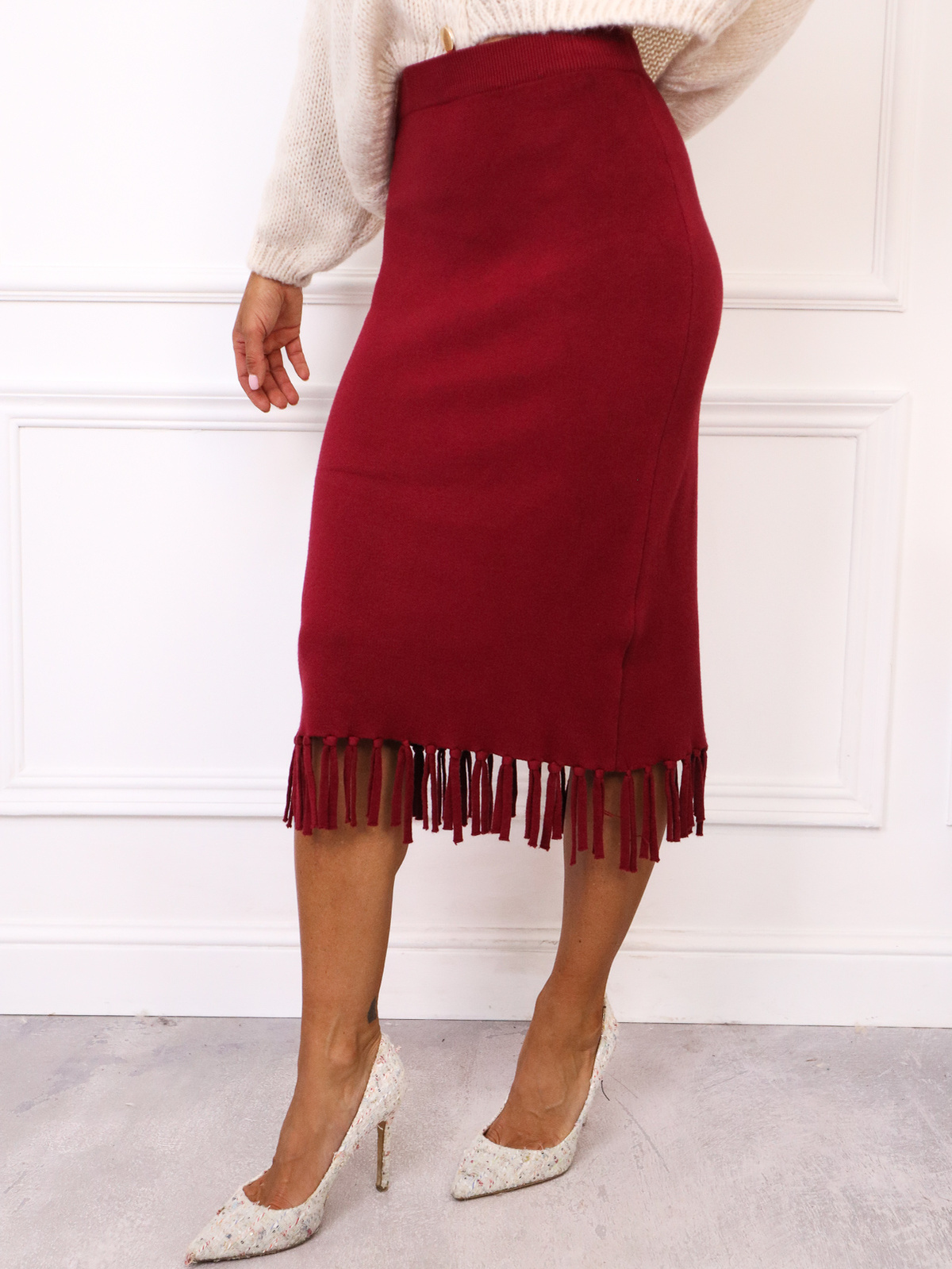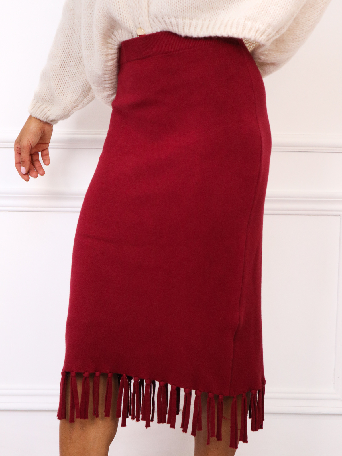 DZIANINOWA SPÓDNICA MIDI ZAKOŃCZONA FRĘDZLAMI-BORDOWA
