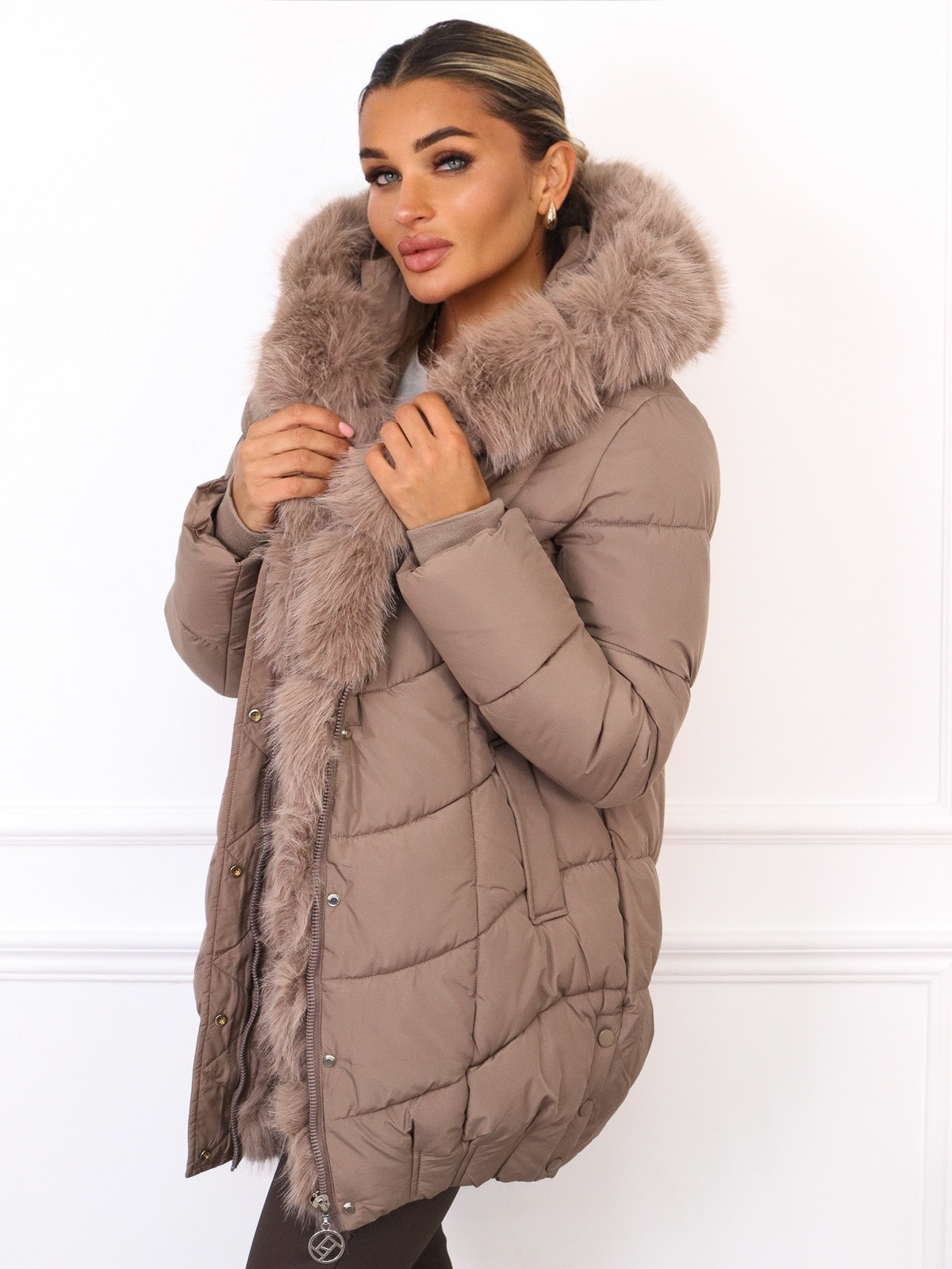 Kurtka pikowana zwężana na dole. Zapinana na zamek i zatrzaski. Odpinane futerko przy kapturze.