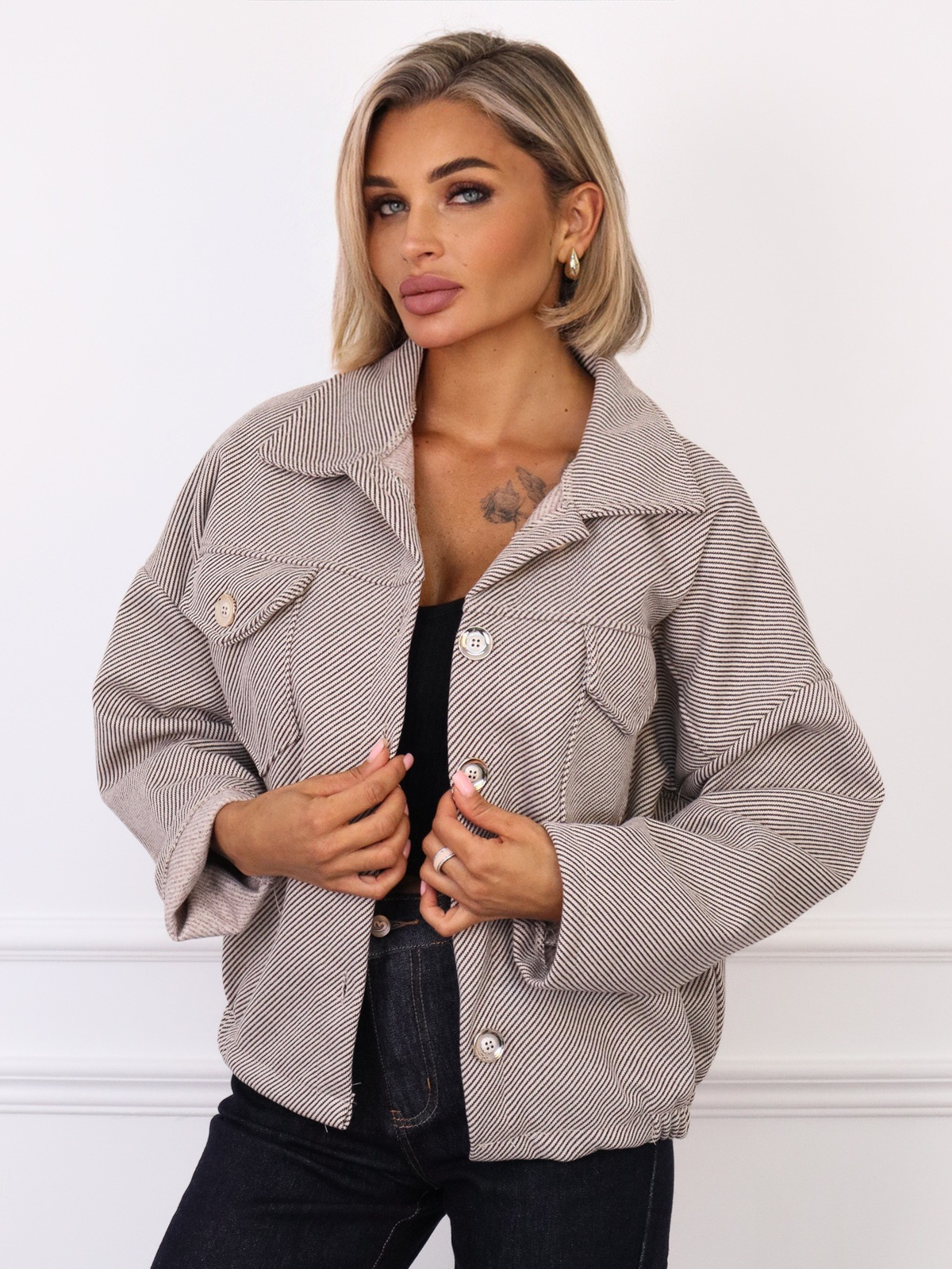 KURTKA OVERSIZE BEŻOWA W BRĄZOWE PASKI ZE ŚCIAGACZEM NA DOLE