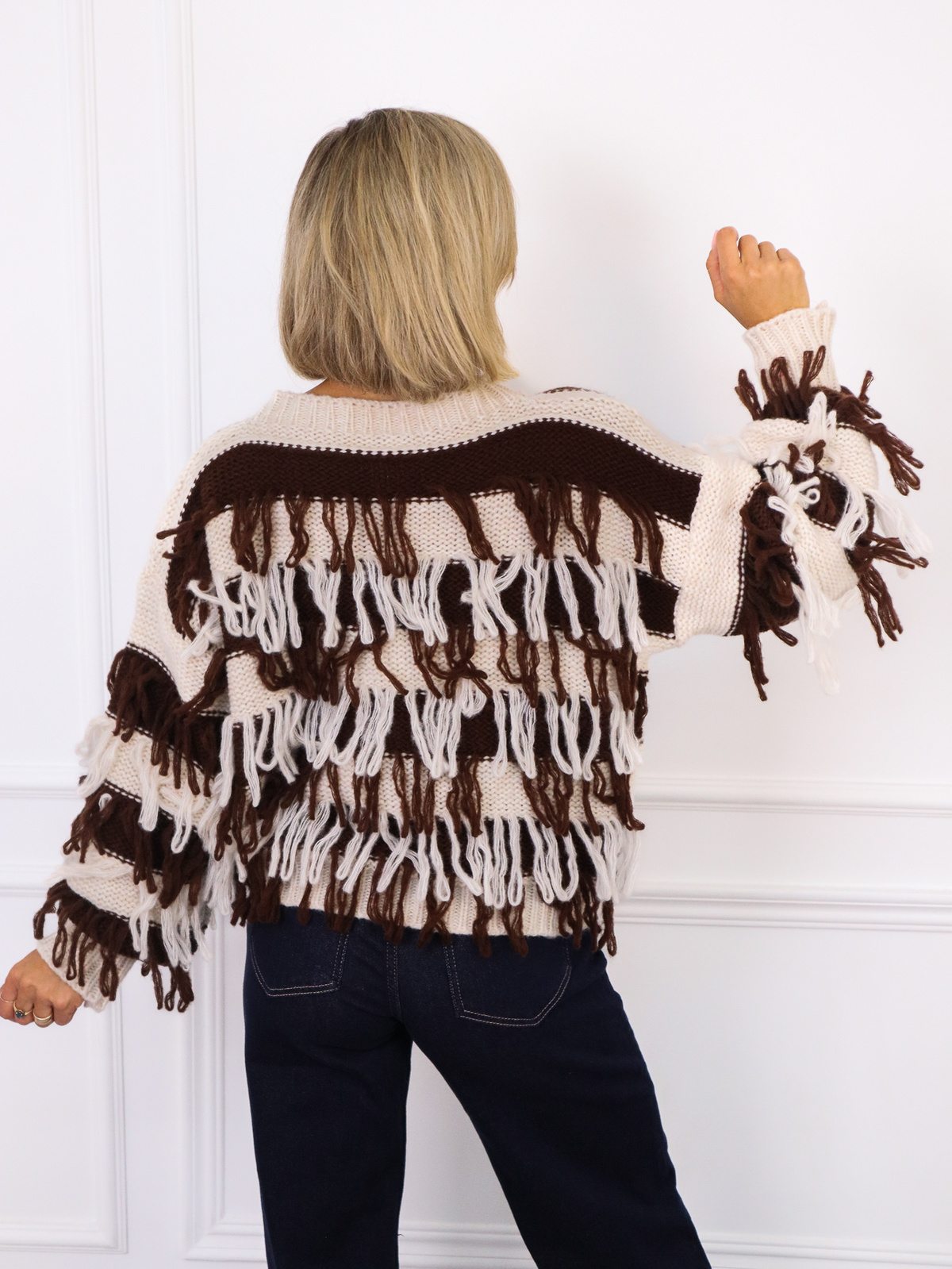 SWETER BEŻOWY W PASKI KOLORU CZEKOLADOWEGO Z FRĘDZLAMI
