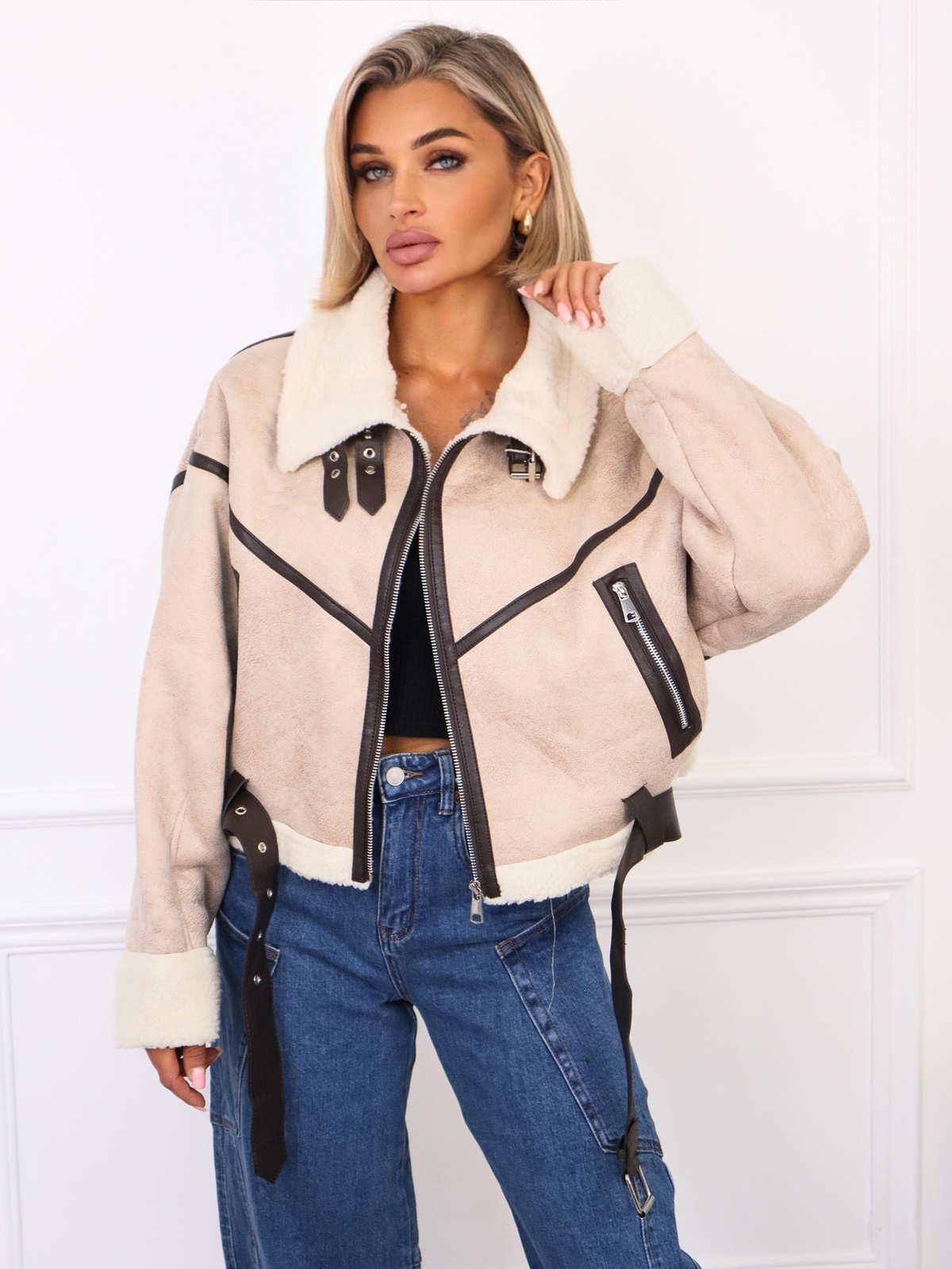 KURTKA ZIMOWA KOŻUSZEK Z PASKIEM NA DOLE- BEŻOWY