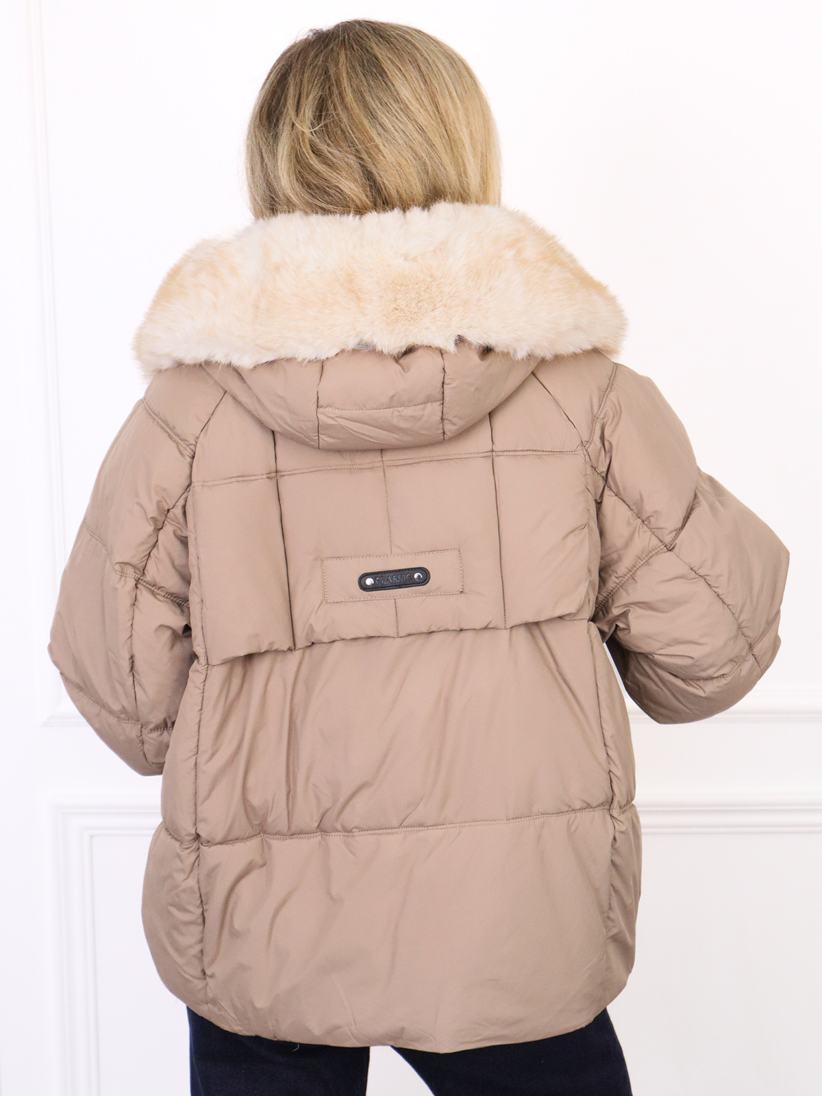 Kurtka puchowa z dzianinowymi wstawkami przy rękawach. Posiada odpinane futerko na kapturze i całej długości zamka. oraz ozdobną naszywkę na plecach.