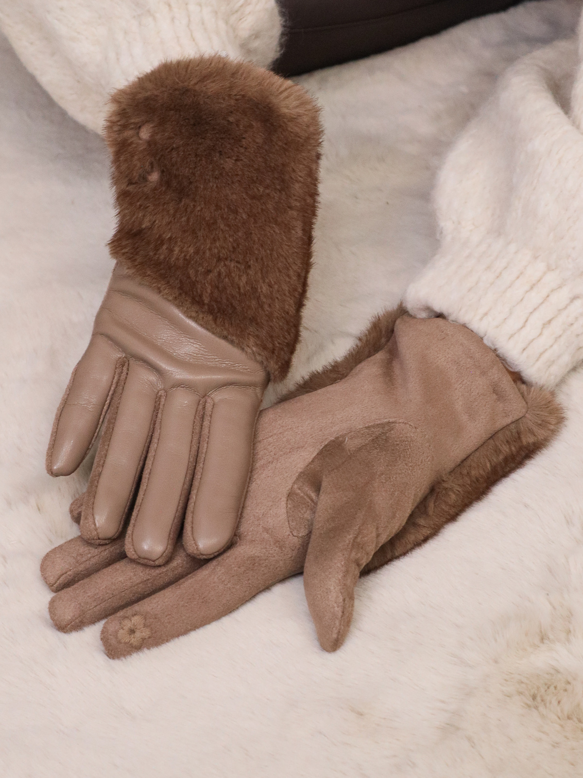 RĘKAWICZKI OCIEPLANE Z EKOSKÓRY I ZAMSZU Z FUTERKIEM- BRĄZOWE