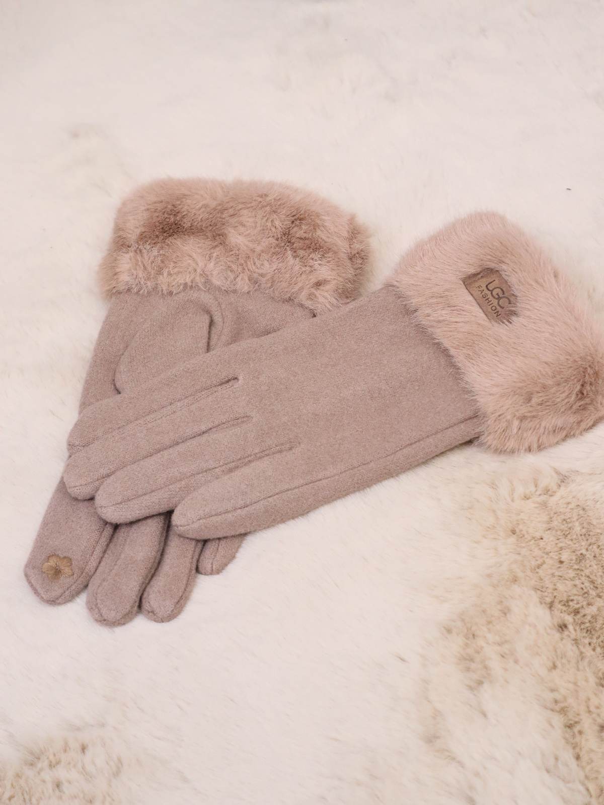Rękawiczki wykonane z przyjemnej w dotyku dzianiny. Posiadają ozdobne futerko oraz naszywkę. Nie są w środku ocieplone Końcówka palca wskazującego umożliwiającym obsługę ekranów dotykowych