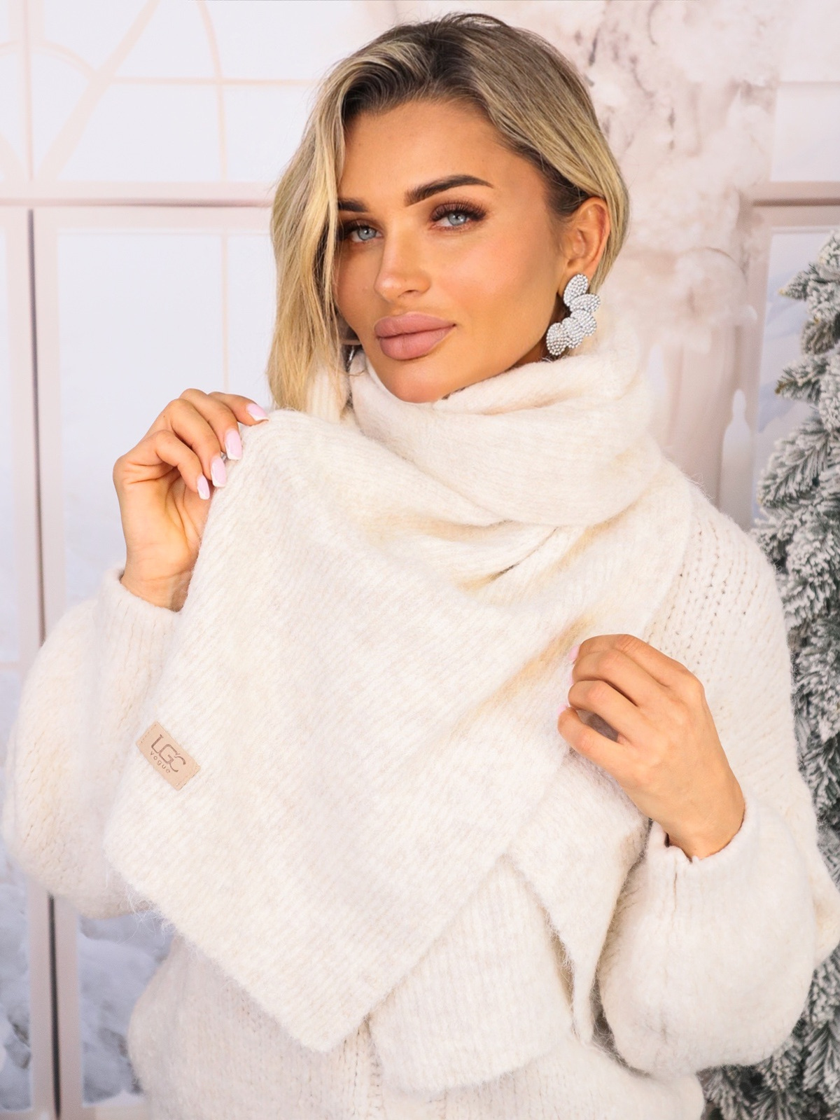 SZAL DZIANINOWY Z DOMIESZKĄ WEŁNY ORAZ LOGO- BEŻOWY