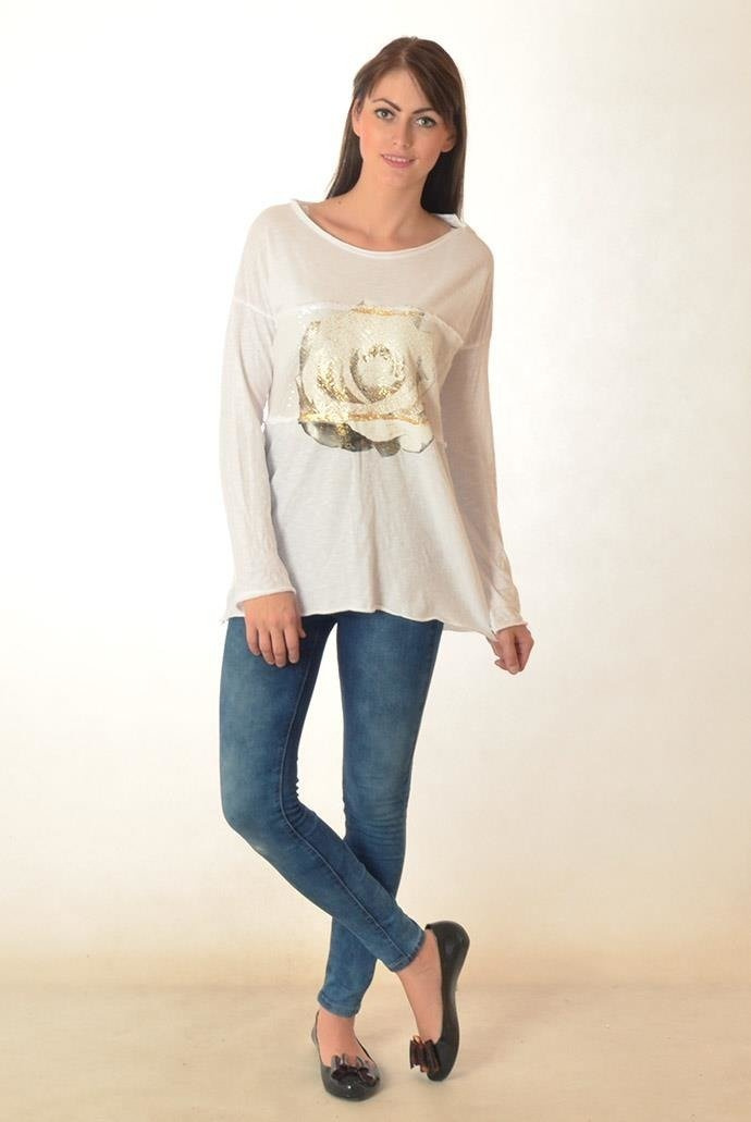 BIAŁA BLUZKA NA DŁUGI RĘKAW, Z PRZODU NADRUK RÓŻY ORAZ PAS CEKINÓW