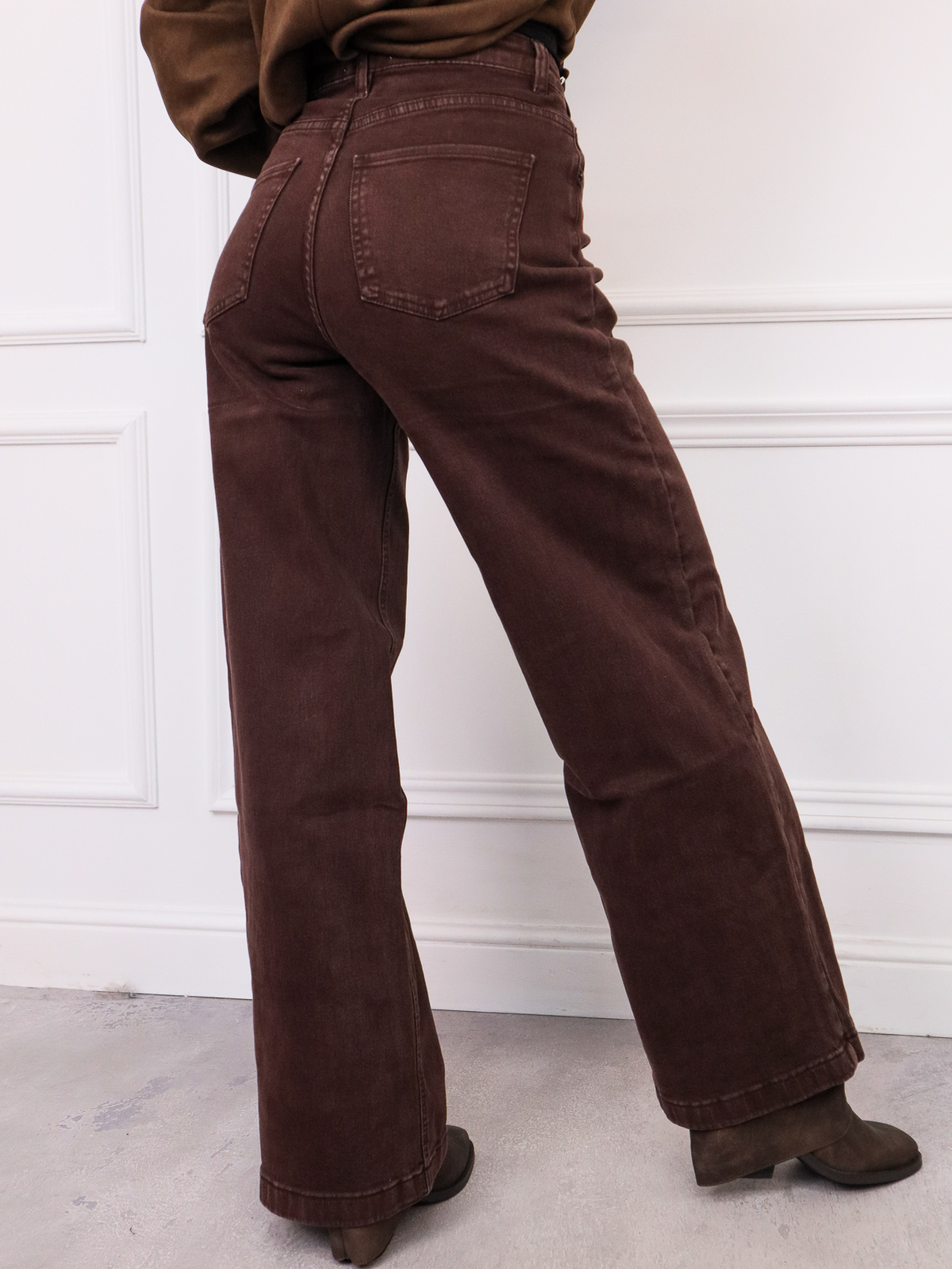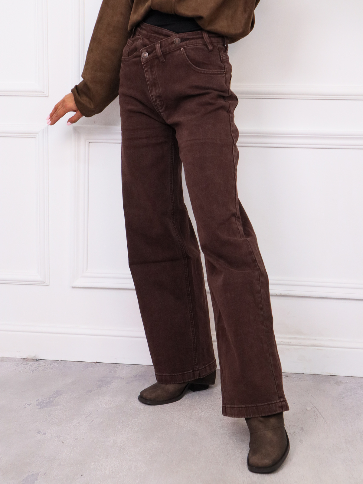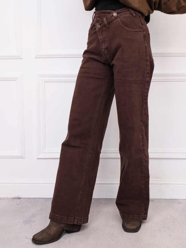 SPODNIE JEANSOWE Z ASYMETRYCZNYM ZAPIĘCIEM I SZEROKIMI NOGAWKAMI- BRĄZOWE