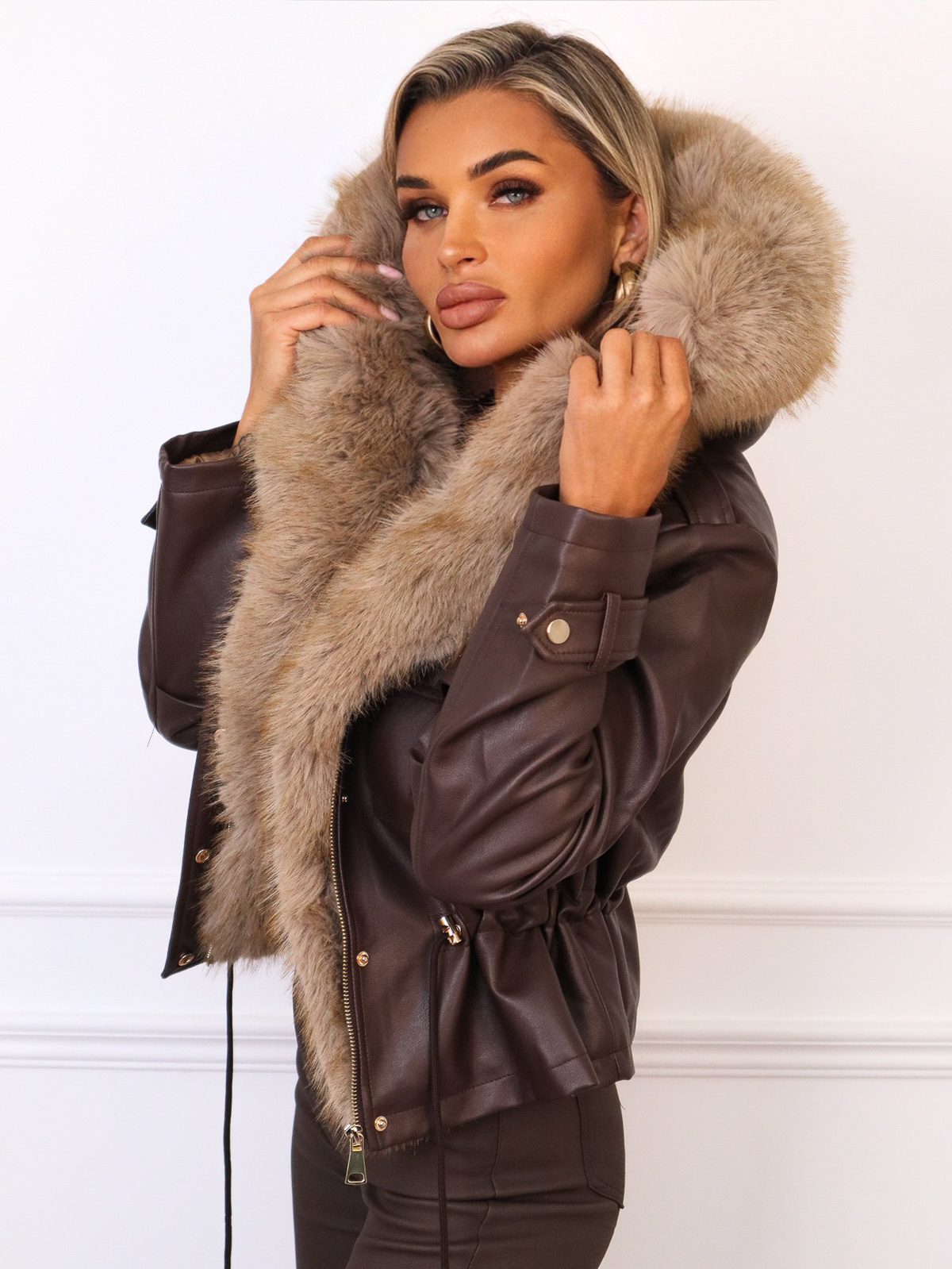 KURTKA Z EKOSKÓRY Z KIESZENIAMI I FUTERKIEM- BRĄZOWA
