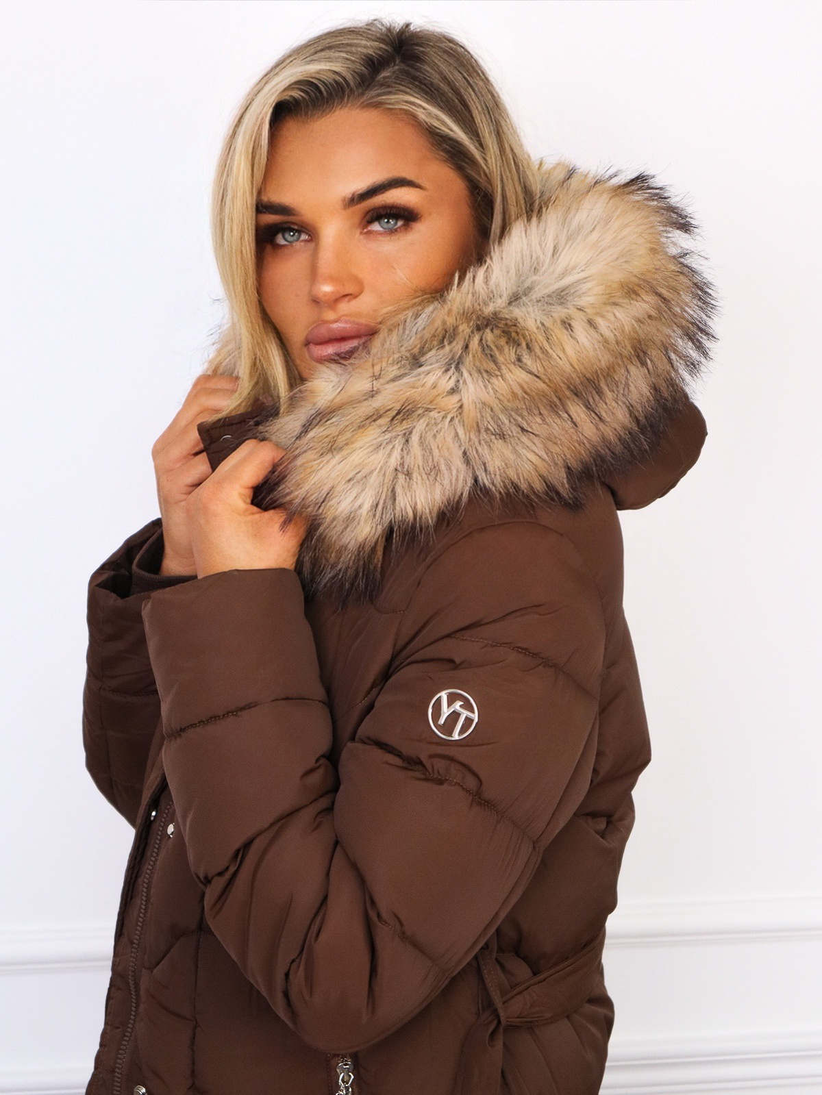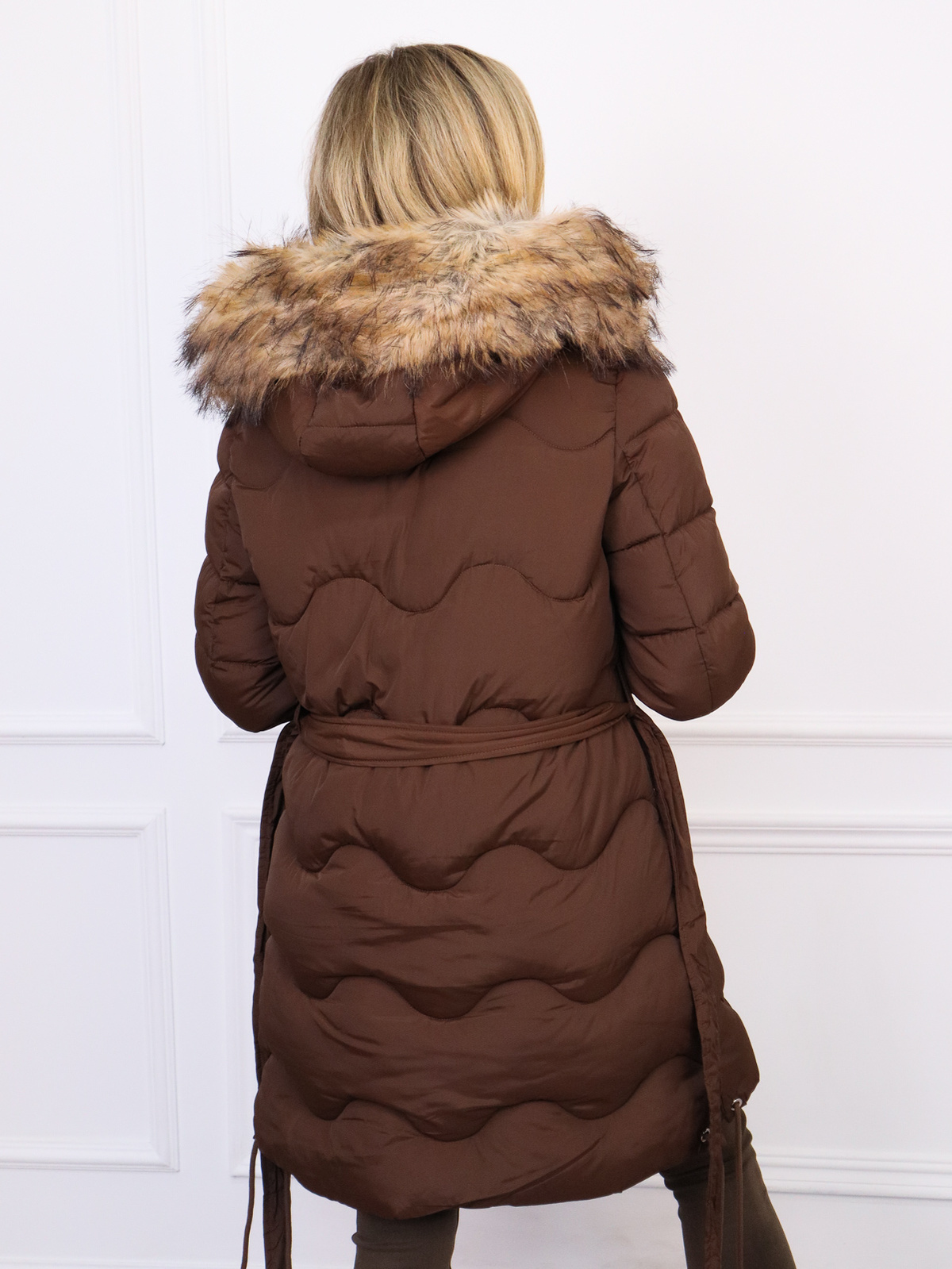DŁUGA KURTKA PŁASZCZ WIĄZANY W PASIE Z FUTERKIEM- CZEKOLADOWA
